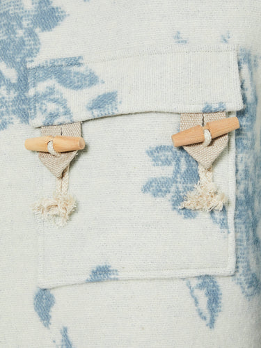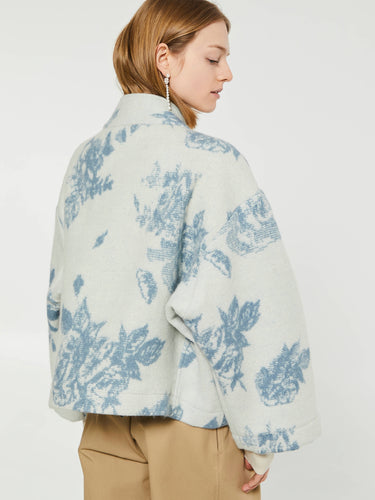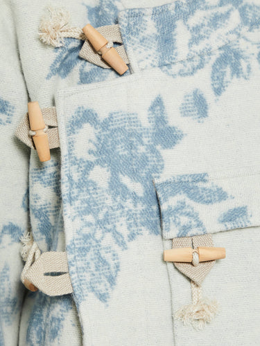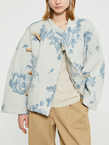 Jacket made from boiled wool with an all-over floral pattern. Designed with an asymmetrical front closure featuring beech wood toggles. Detailed with a large front pocket and two side pockets. The boiled wool fabric is pre-shrunk, giving it a dense and soft texture that is wind-resistant, insulating, and water-repellent. Made in Lithuania from 100% wool sourced from Latvia and Sweden.