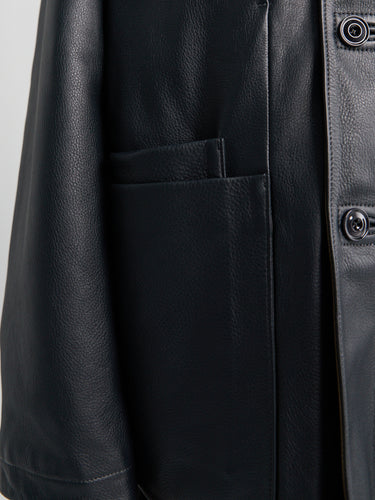 This jacket reflects Lemaire’s workwear style, crafted from thick grained cow leather. It has a straight cut, shirt collar, front buttons, long sleeves with buttoned cuffs, and multiple pockets, including patch and welted inside ones. The interior features a leather label embossed with the Lemaire logo