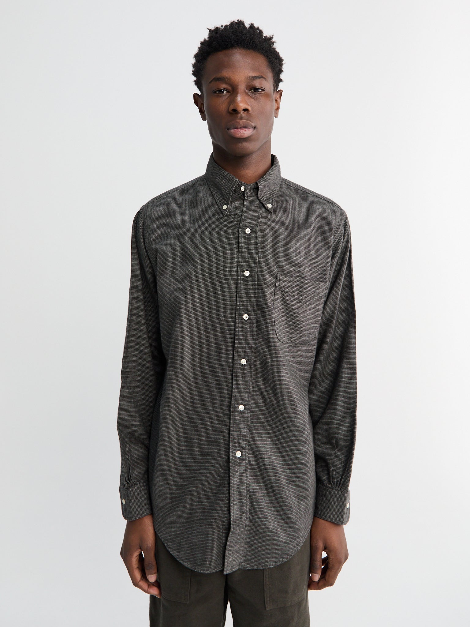 This subtly brushed mini check shirt in charcoal features a relaxed fit that updates the classic button-down style. Made from a soft cotton and Tencel blend, its lightweight, drapey fabric provides comfort and a smooth silhouette
