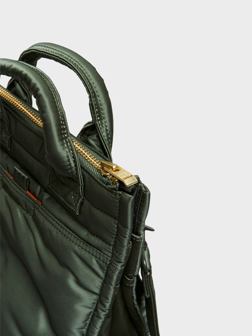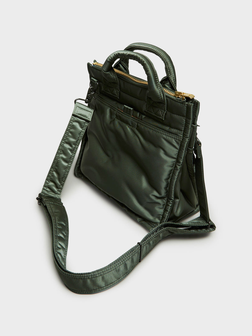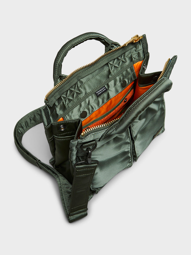 Tanker Square Tote Bag features a main compartment with snap closure, multiple interior pockets, and several exterior pockets for organized storage. The bag includes a handle, an adjustable and detachable shoulder strap, and comes with a dust bag for protection