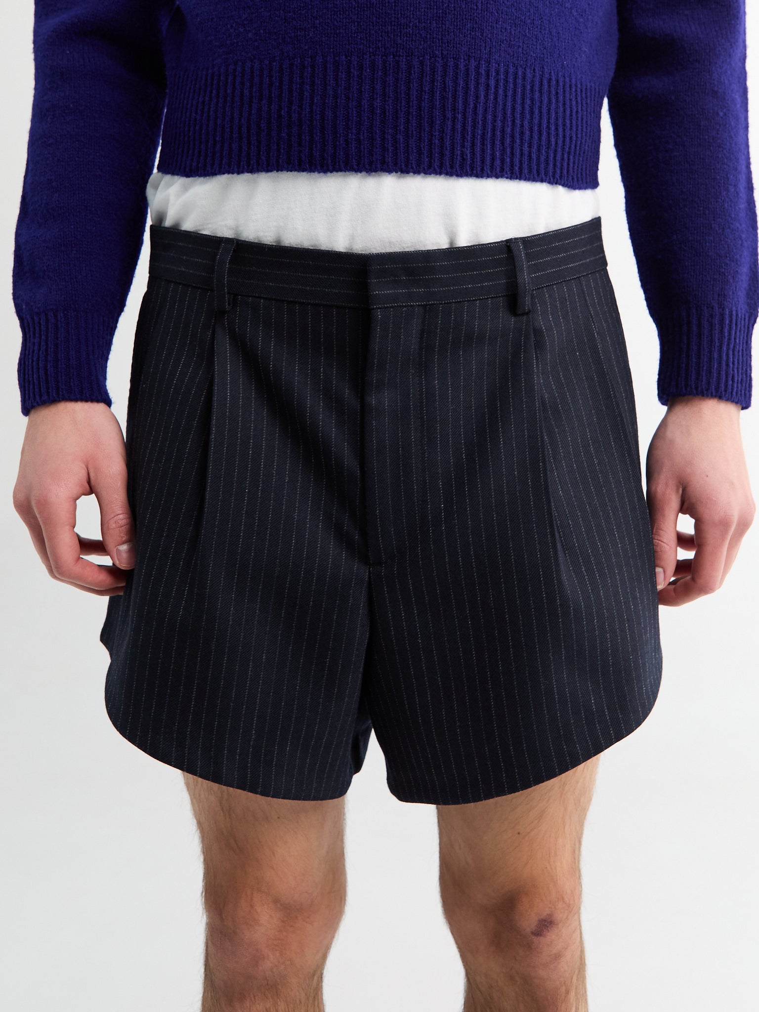 Sunflower’s pleated shorts are tailored to a wide, relaxed silhouette. Crafted from a navy stripe fabric, they feature a single front pleat that creates a clean drape and a distinct shape.