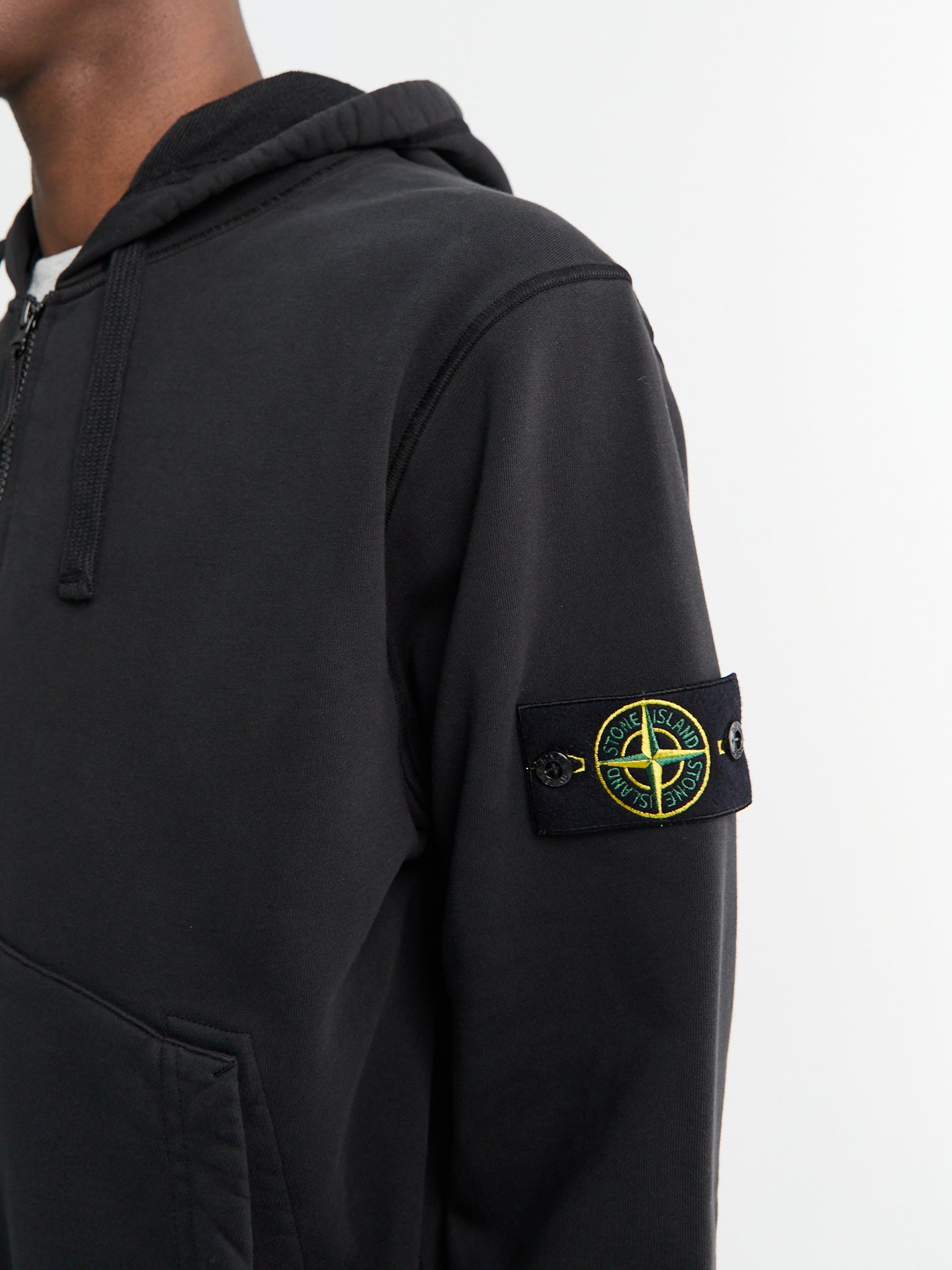 This black hoodie is made from organic cotton fleece for comfort and durability. It features a zip-up front, hand pockets with slanted openings, and elasticated ribbed trims for a secure fit