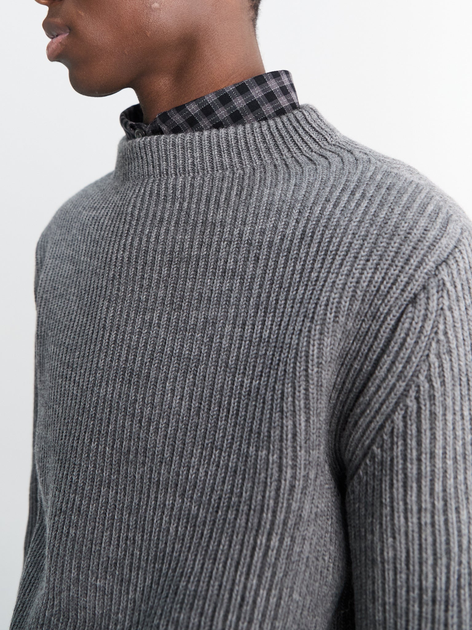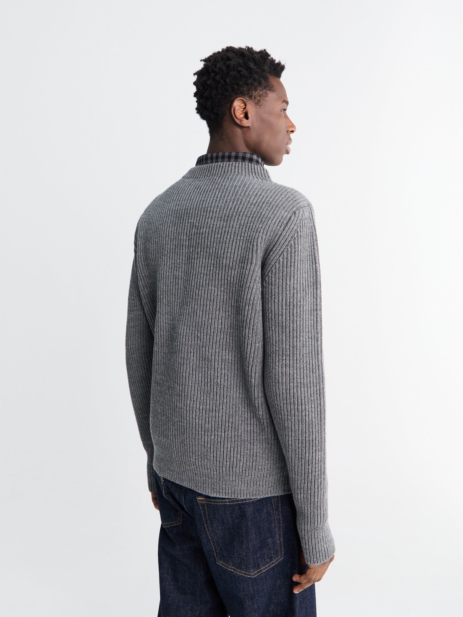 Navy Crewneck in Grey, a versatile sweater crafted with pure new wool. With a symmetrical crewneck and extended rib with thumb. Knitted on a 5 gauge flat knitting machine with bar tacks.