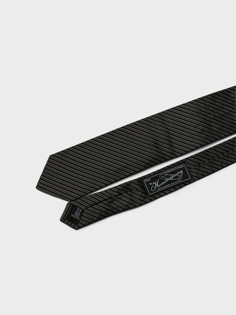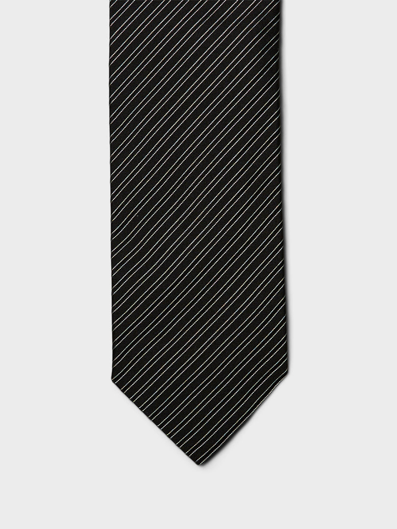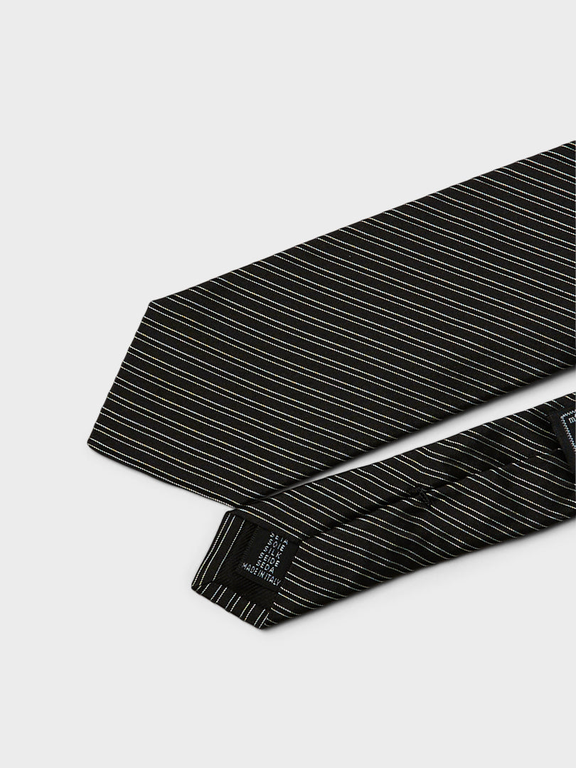 The Banquet Tie is woven from silk in Italy with a black ground and fine diagonal stripes in silver