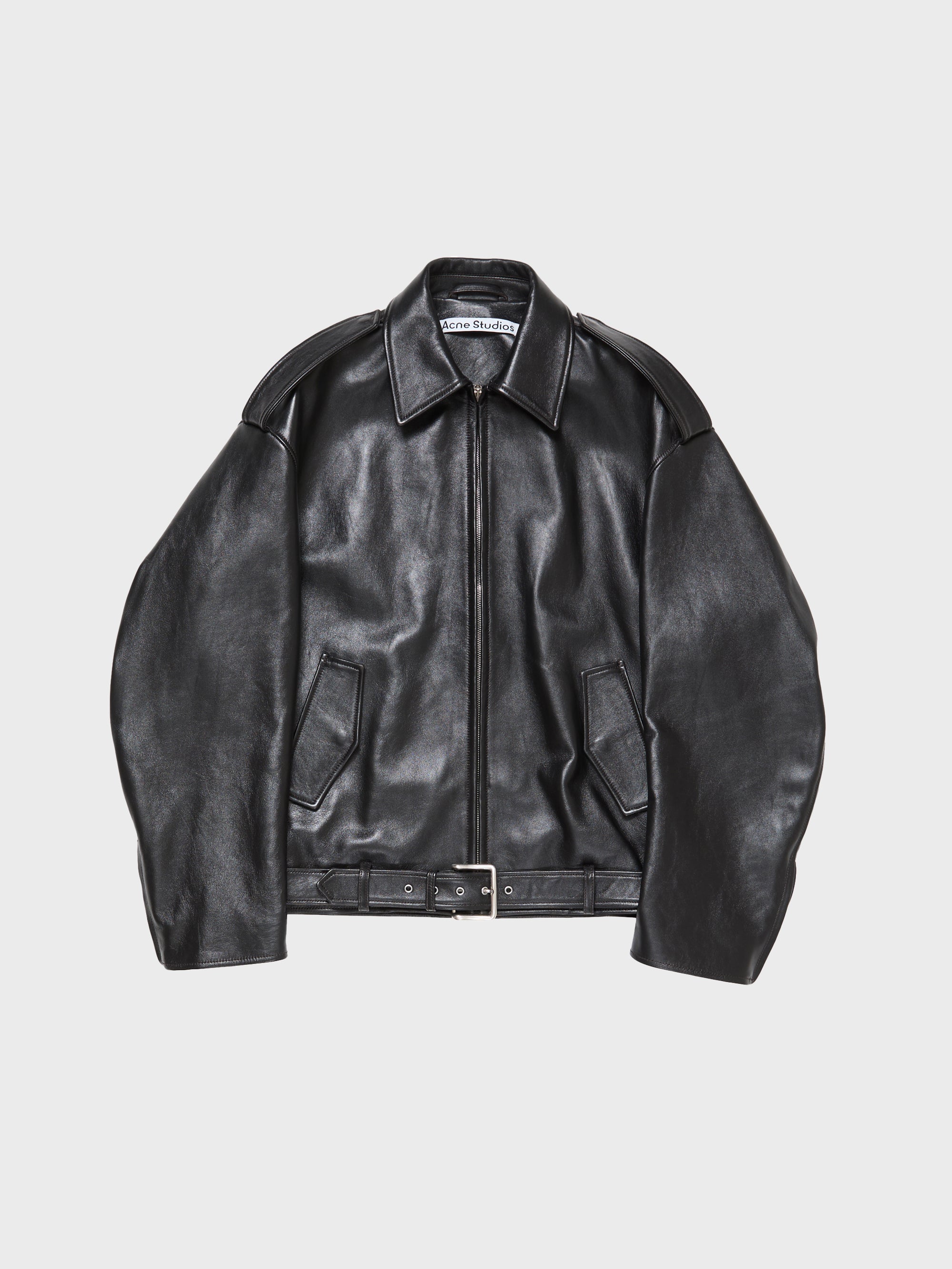 This biker jacket is made from smooth, full-grain leather. It is designed with a relaxed fit, it offers relaxed sleeves, dropped shoulders, and a length that falls below the hips. The jacket includes a zipper front, epaulettes, side seam pockets, and front flap pockets, along with a belt at the hem. The jacket also features tabs with hidden snaps at the waist and zippered sleeves.