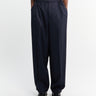 These relaxed, tailored trousers feature a mid-high rise and are crafted from wool. They include an elastic waistband at the back, a three-horn button fly, and pressed pleats. The wide, straight legs end with an elastic drawstring hem. The design is completed with back patch pockets for added detail.