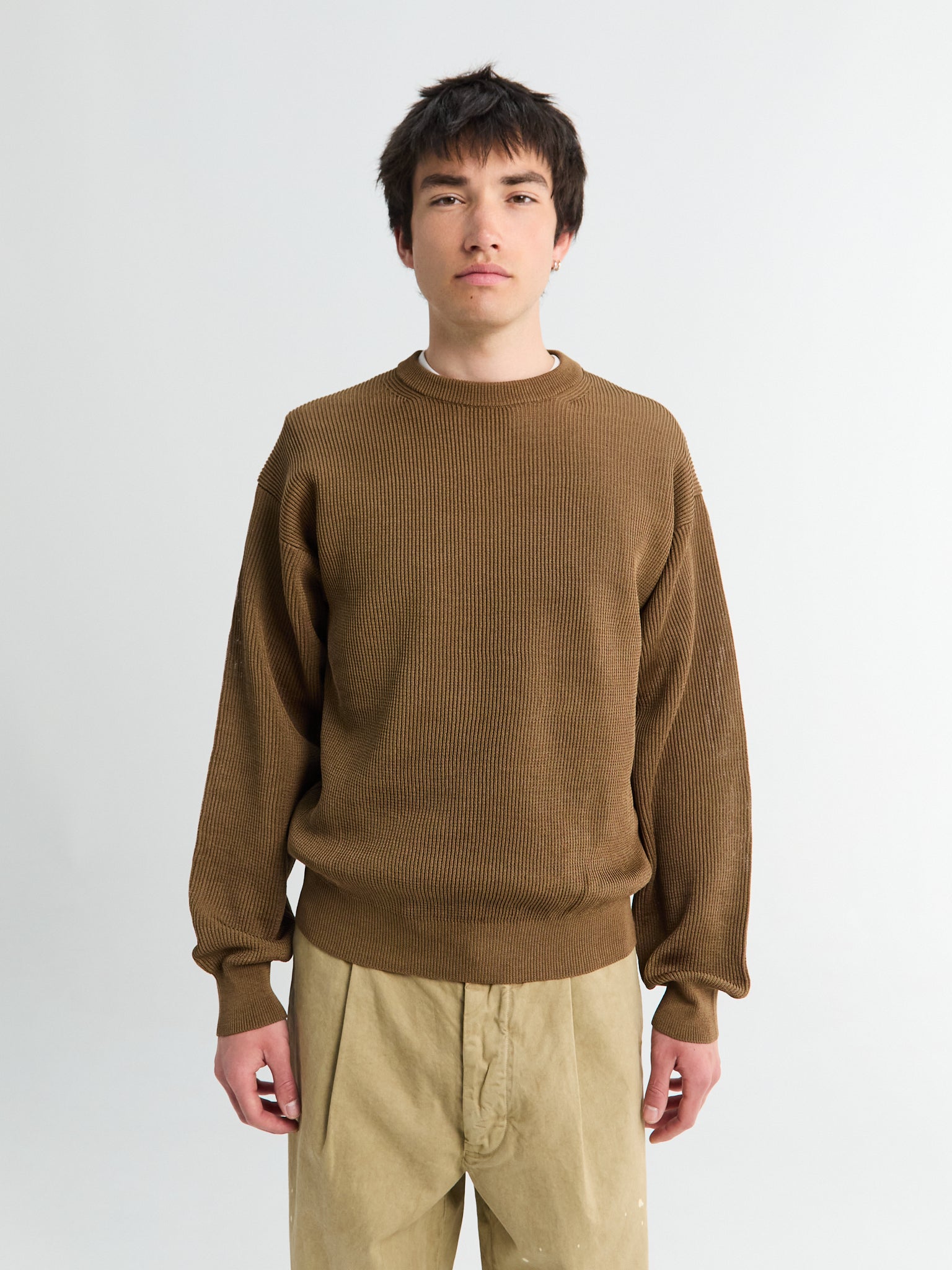 This knit is crafted from a crisp, flat yarn for a distinctively dry handfeel. The all-over rib construction lends structure and texture, while the relaxed, straight silhouette is finished with a classic crewneck.