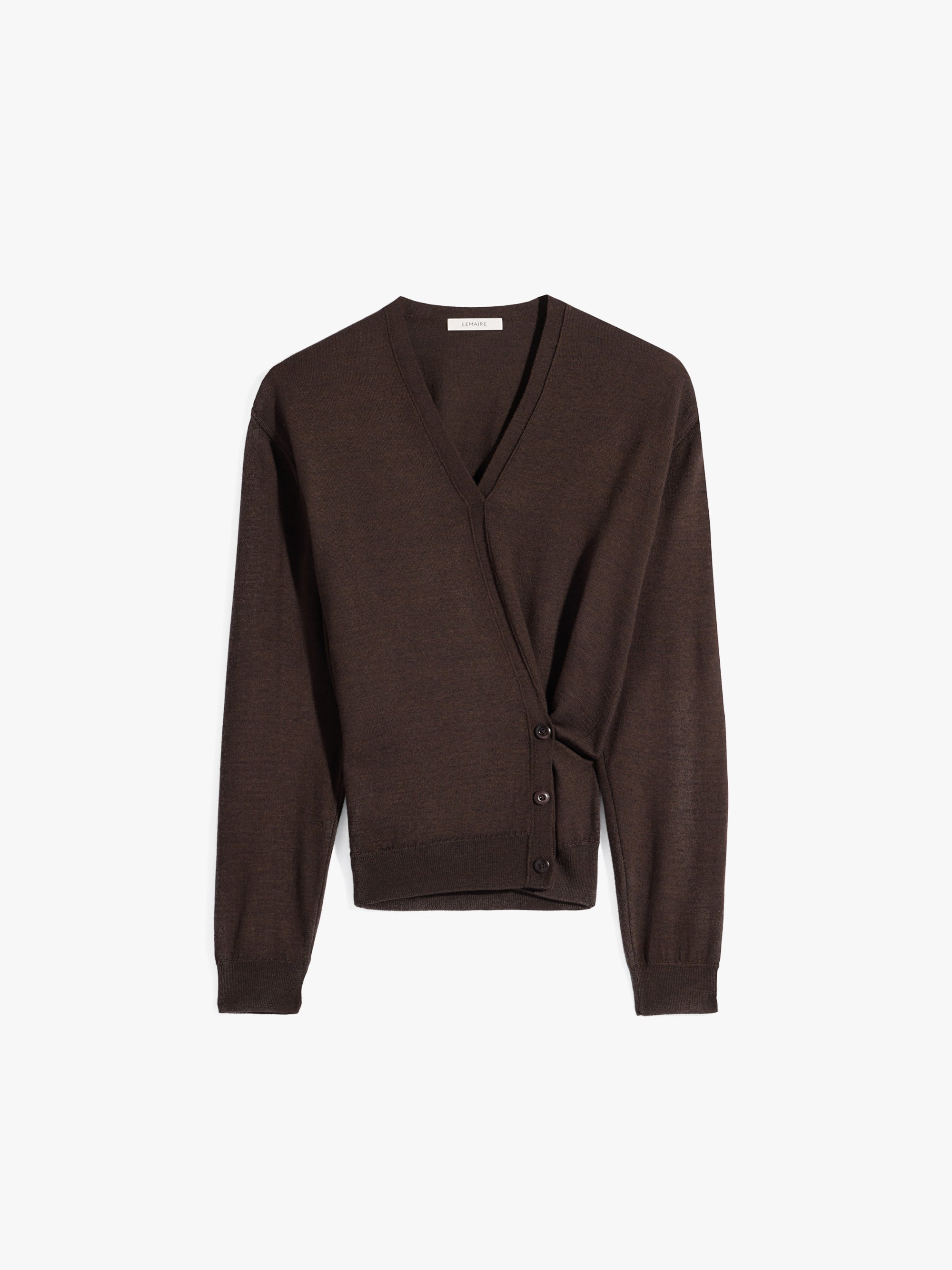 This wool and acrylic blend cardigan delivers understated elegance in a rich Dark Cacao shade. The V-neck silhouette is complemented by a front button closure and distinctive side buttons that create an asymmetrical fastening detail. Long sleeves with ribbed trims provide a polished finish, while the regular fit ensures a comfortable fit