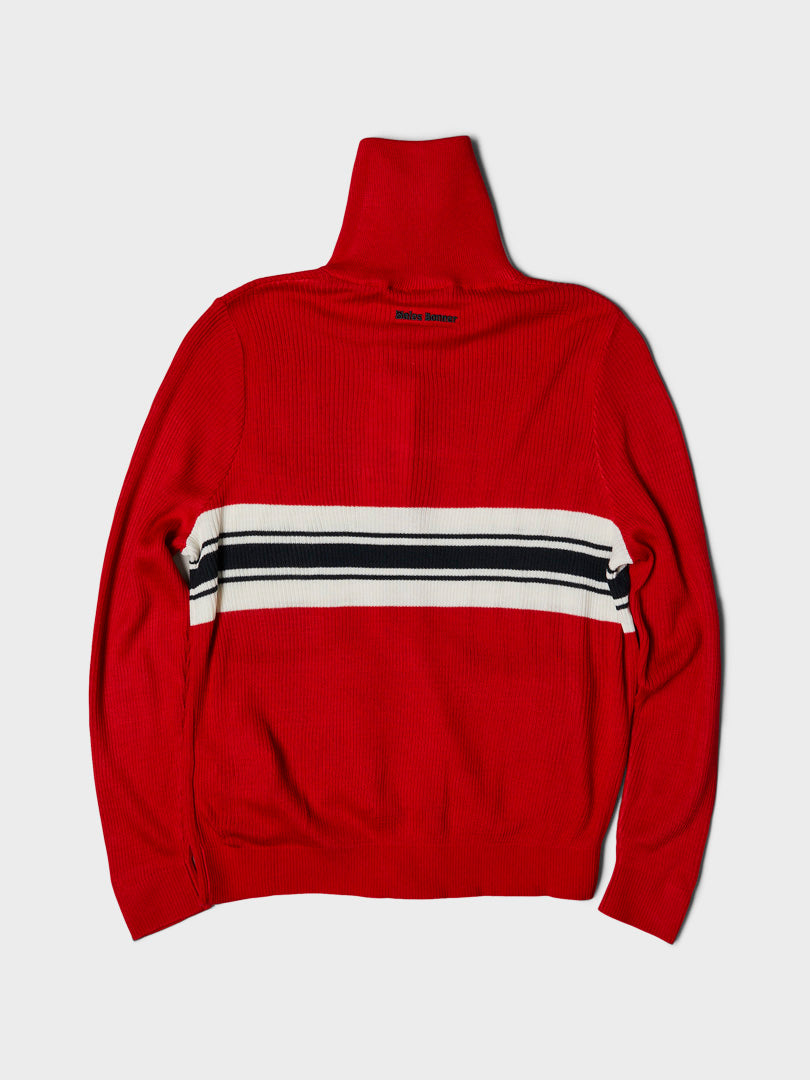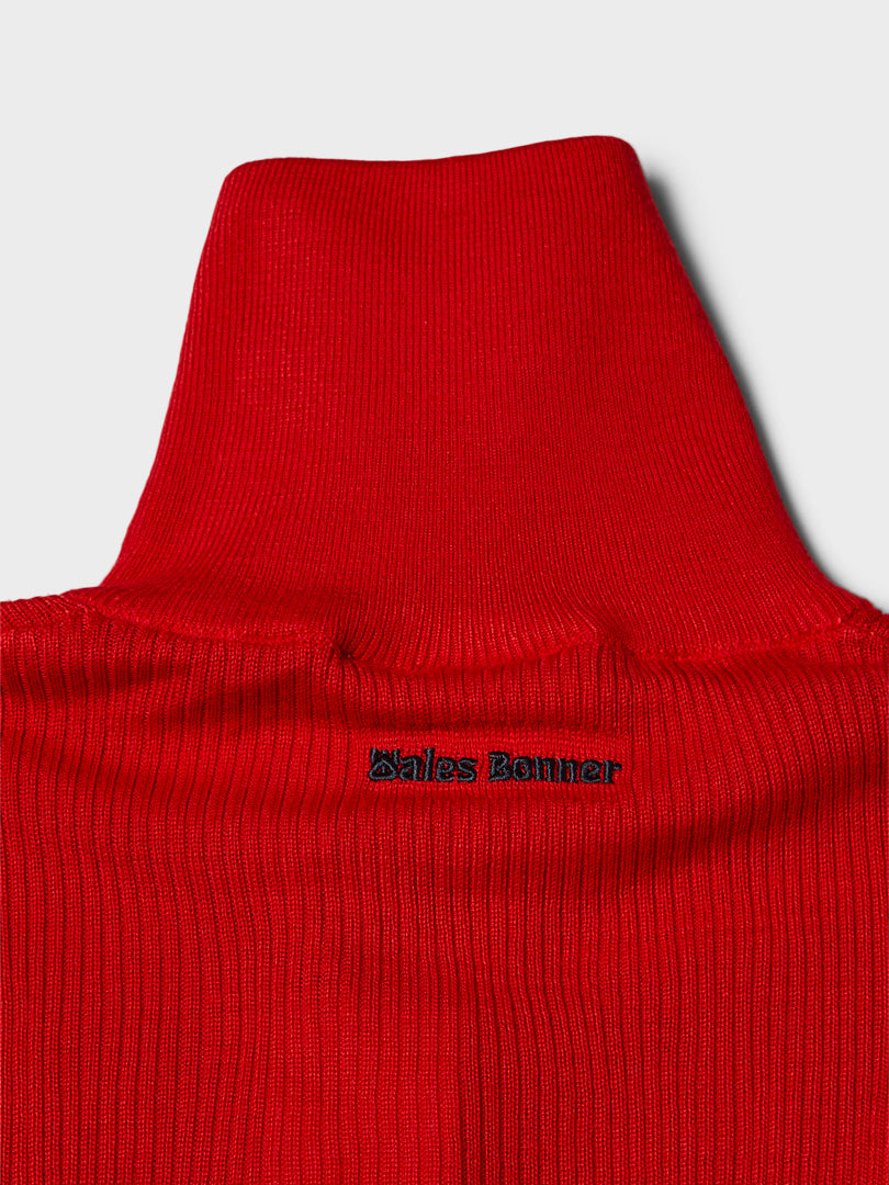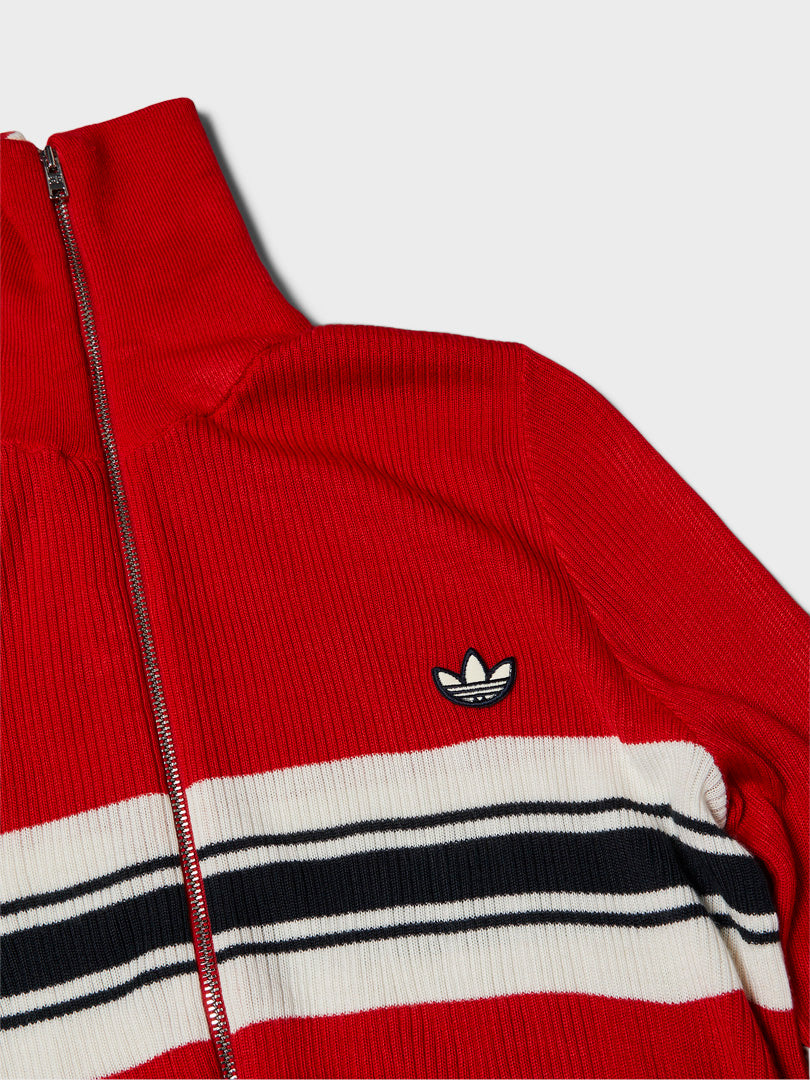 Red knitted track top made in collaboration with Wales Bonner. Features contrasting horizontal stripes, adidas and Wales Bonner logos, and a double front zip.