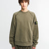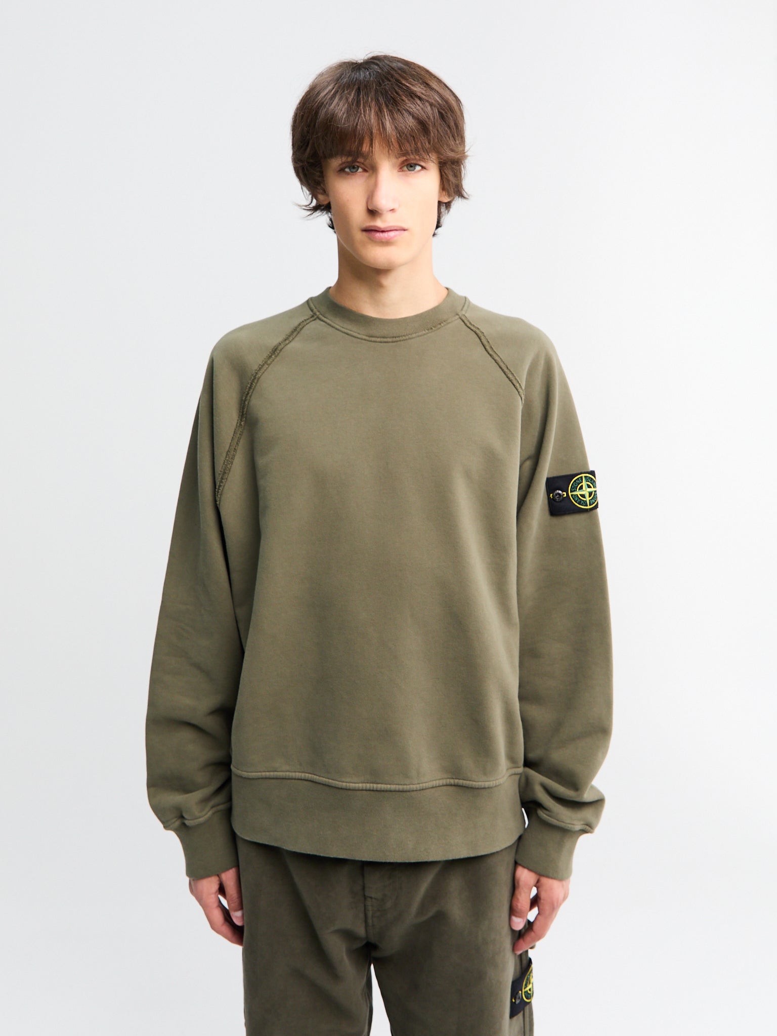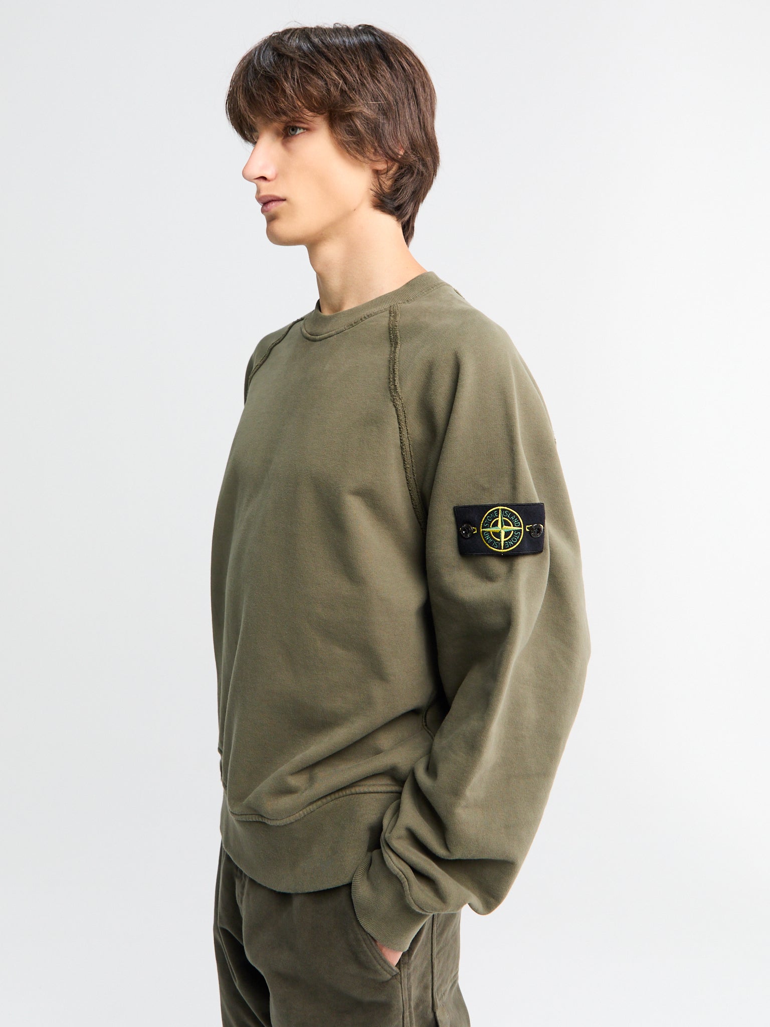 Crewneck sweatshirt crafted from brushed organic cotton fleece. Features elastic ribbed trims and ribbed triangular shapes at the shoulders and side. Garment dyed finish with the Stone Island badge on the sleeve.