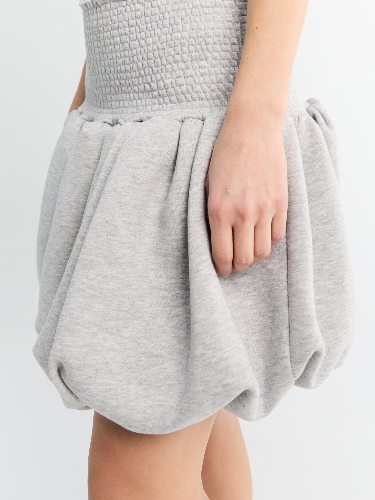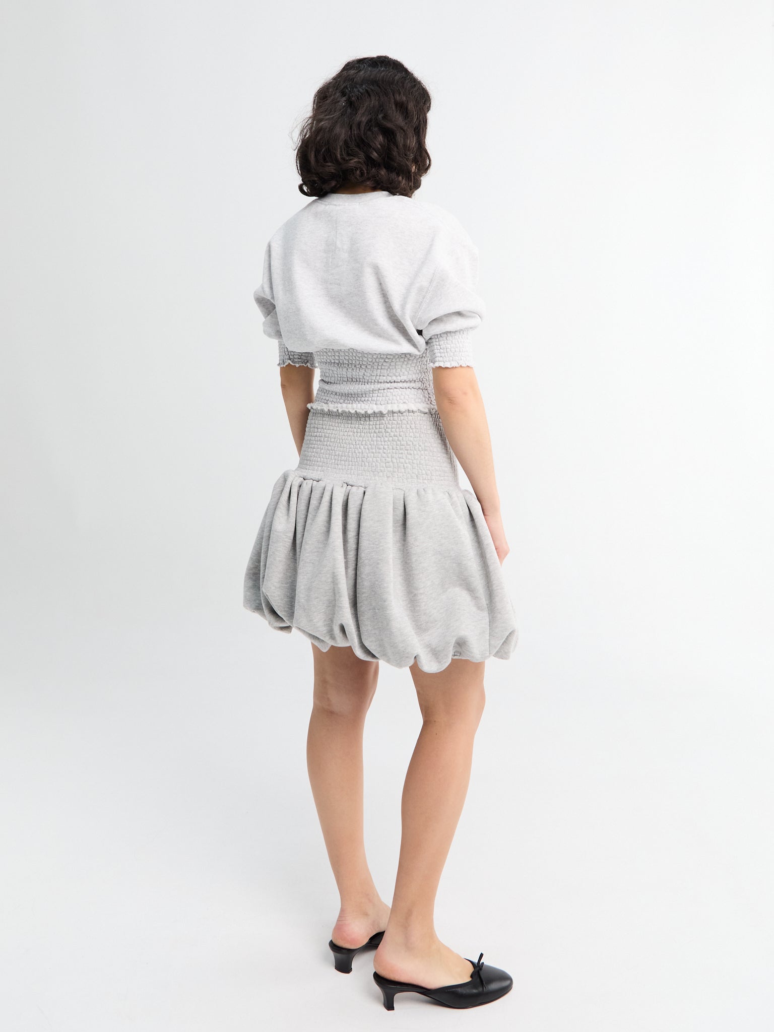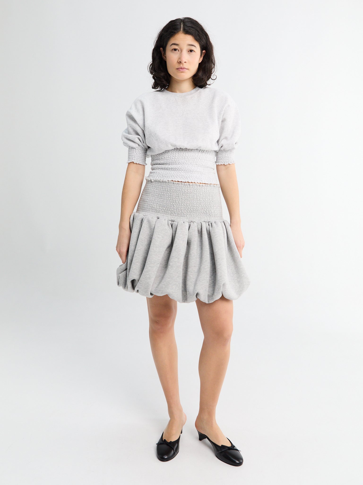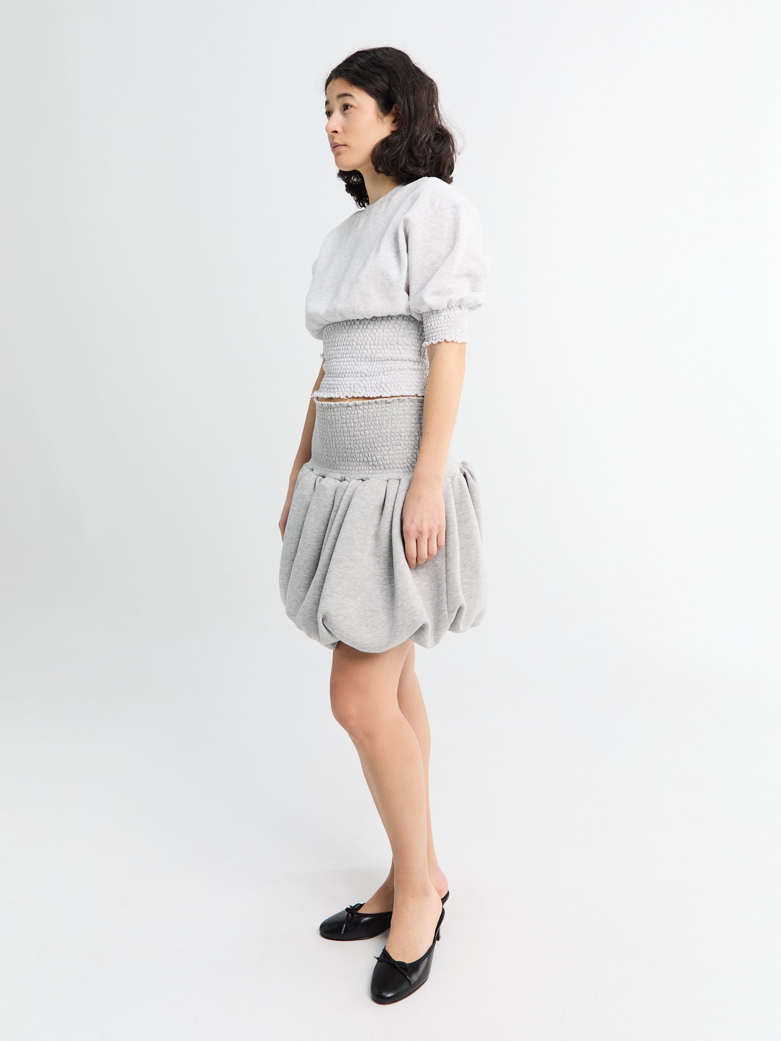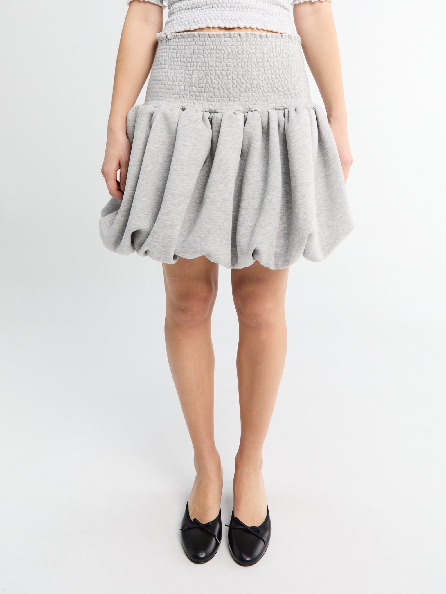 The Camilla Skirt is defined by a sculptural, asymmetric drape in a soft grey melange. Its high-waisted silhouette is shaped by precise construction, creating intentional form and movement.