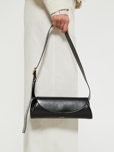 This black Cannolo Bag from Jil Sander features a 100% calf leather construction, adjustable leather strap, inner card slot, magnetic button closure, and nappa lining. Its foil embossed Jil Sander logo completes the design.
