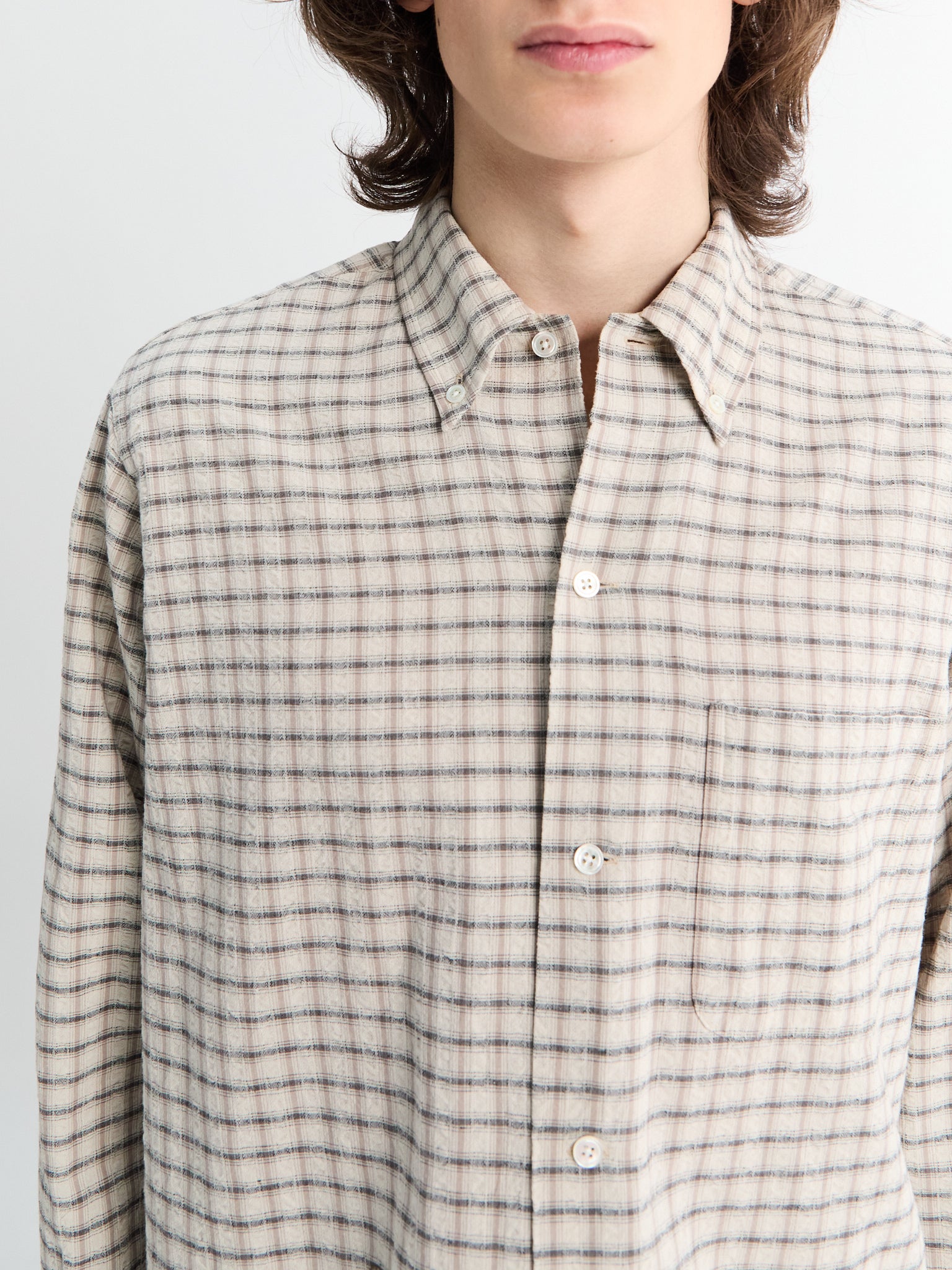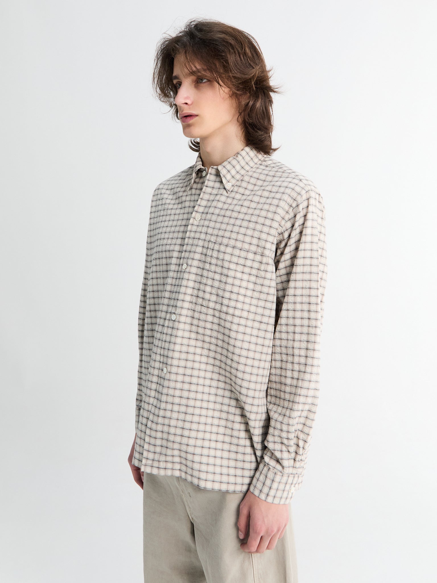 This Beams Plus shirt is crafted from a textured sucker plaid, a puckered weave that offers lightweight and breathable wear. It features an open button-down collar and is finished with a single chest pocket.