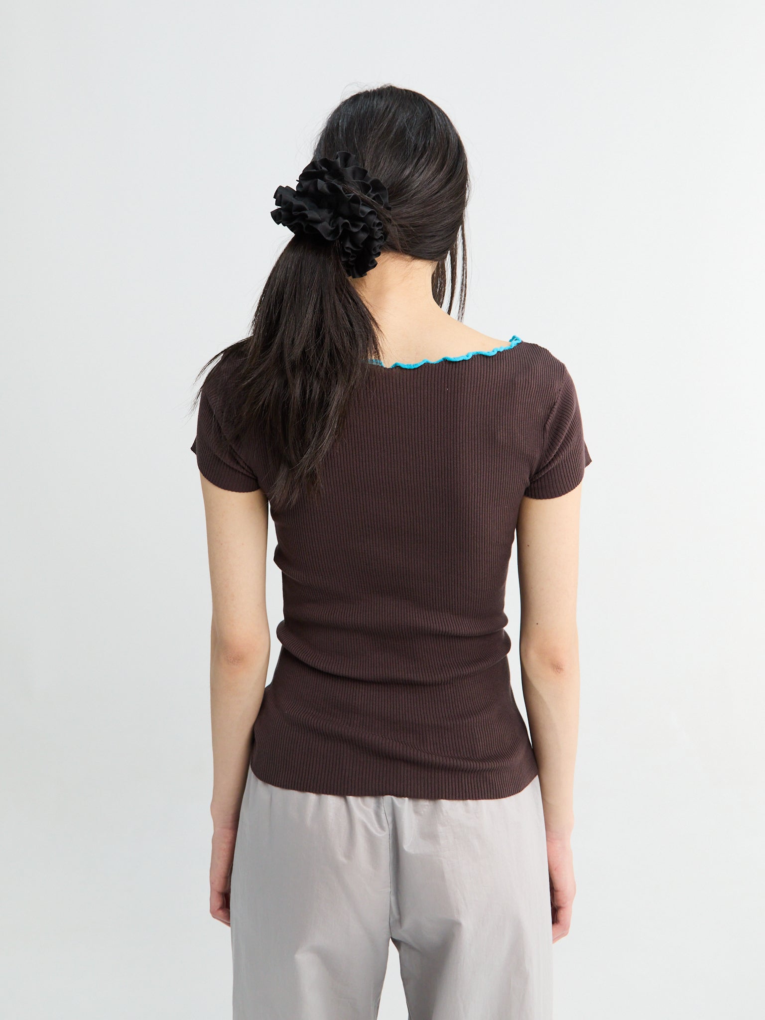 This fitted top is crafted from a textured ribbed cotton. The silhouette is finished with a contrasting, wavy blue trim.
