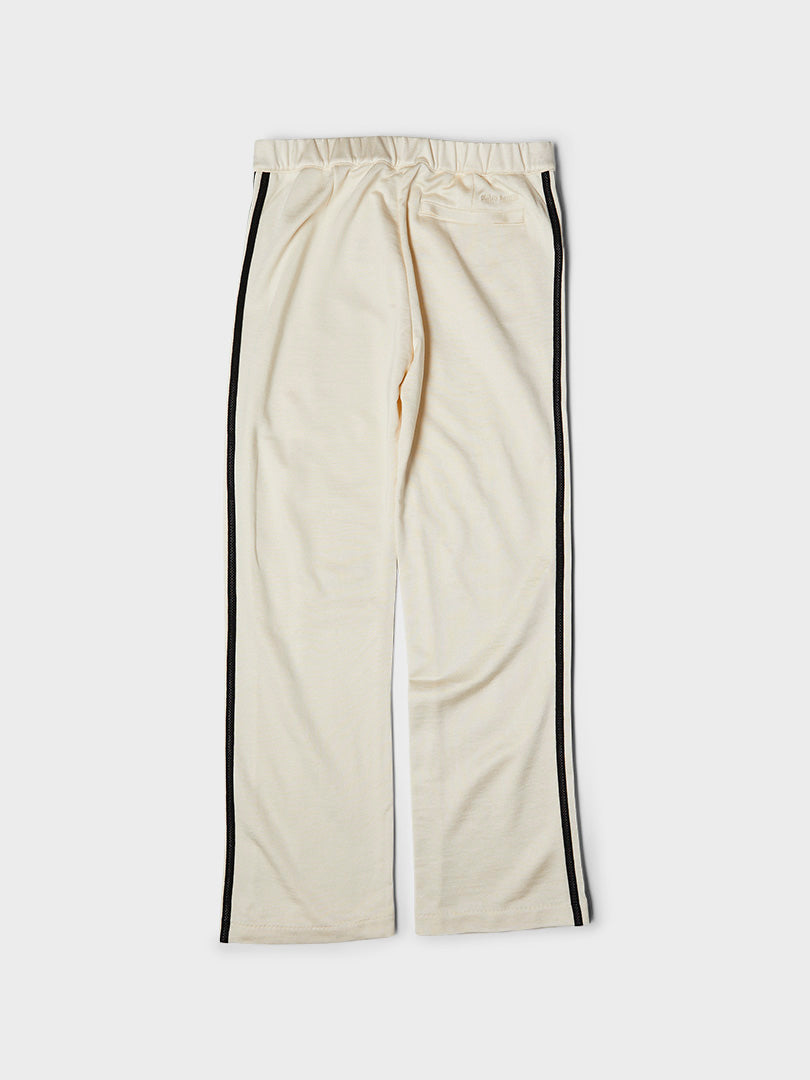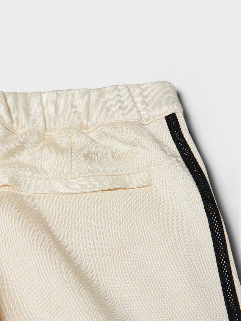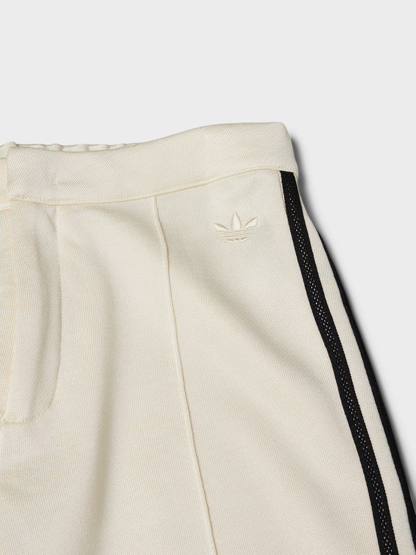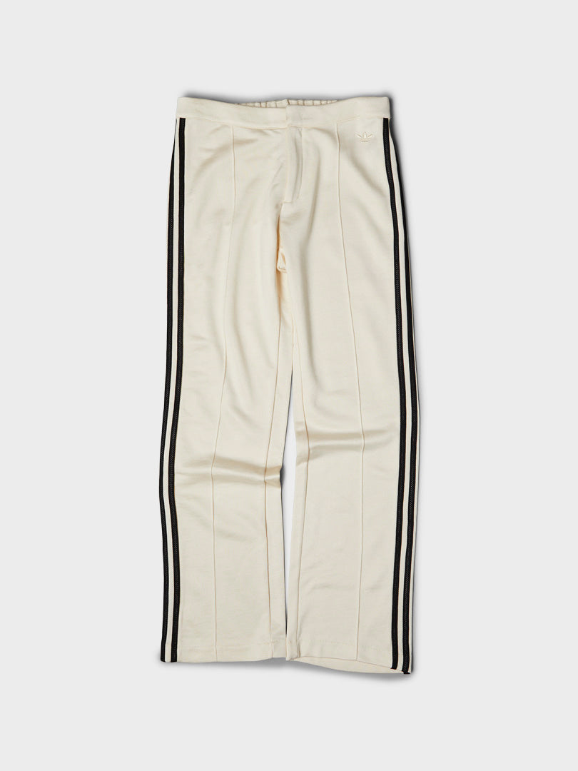 Track pants in collaboration with Wales Bonner. Made in an off-white colourway with contrasting black Three Stripes, a zip fly, and a cinched back waist.