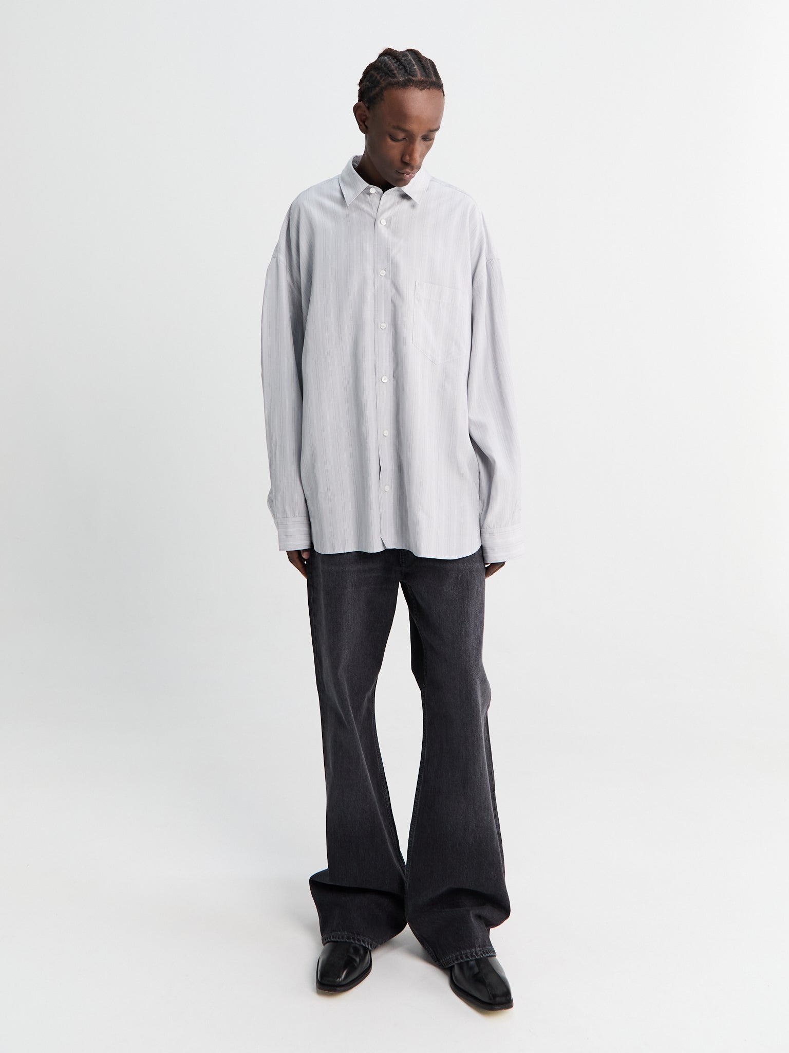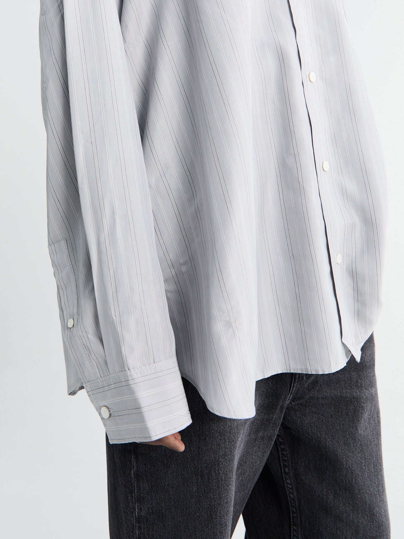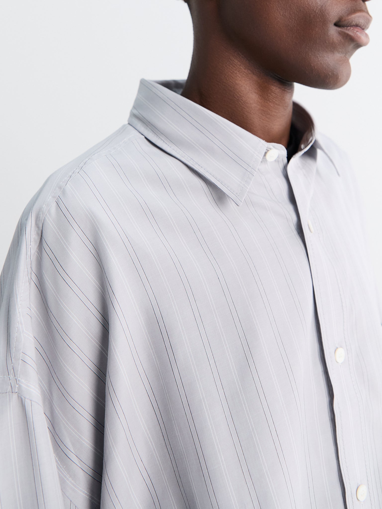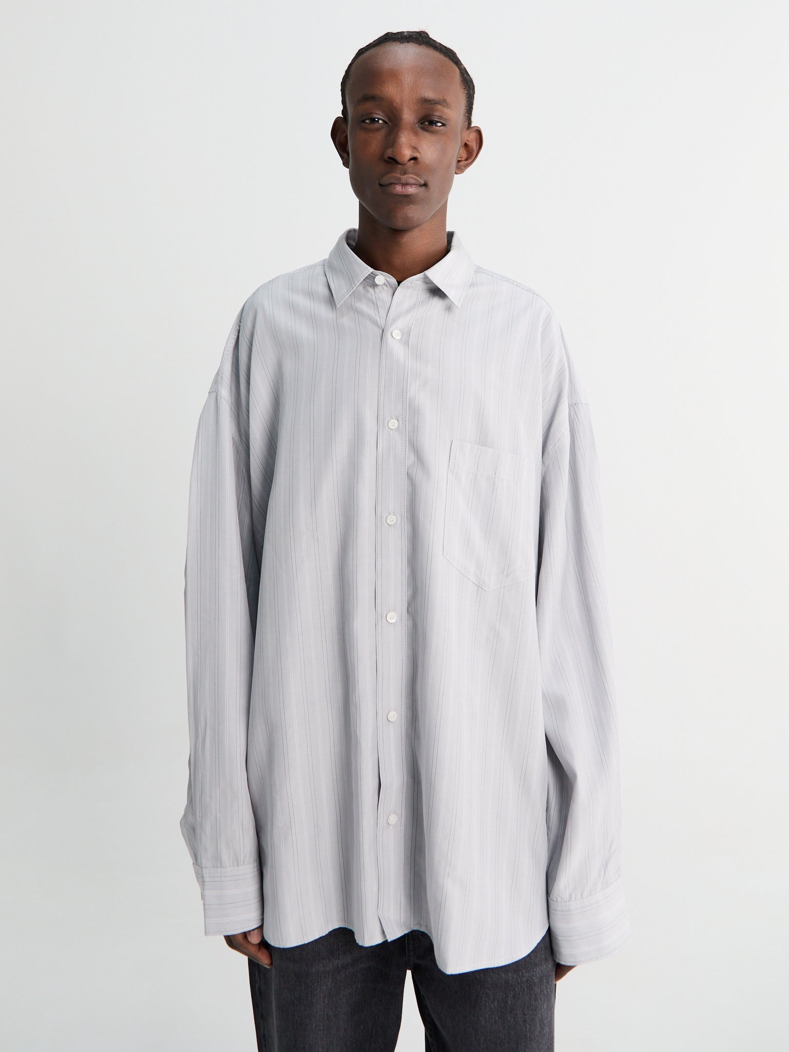 The Soffia shirt is crafted from lightweight cotton poplin in a yarn-dyed stripe. Designed with an intentionally oversized silhouette, it features dropped shoulders, a point collar, and a single chest pocket.