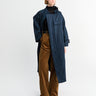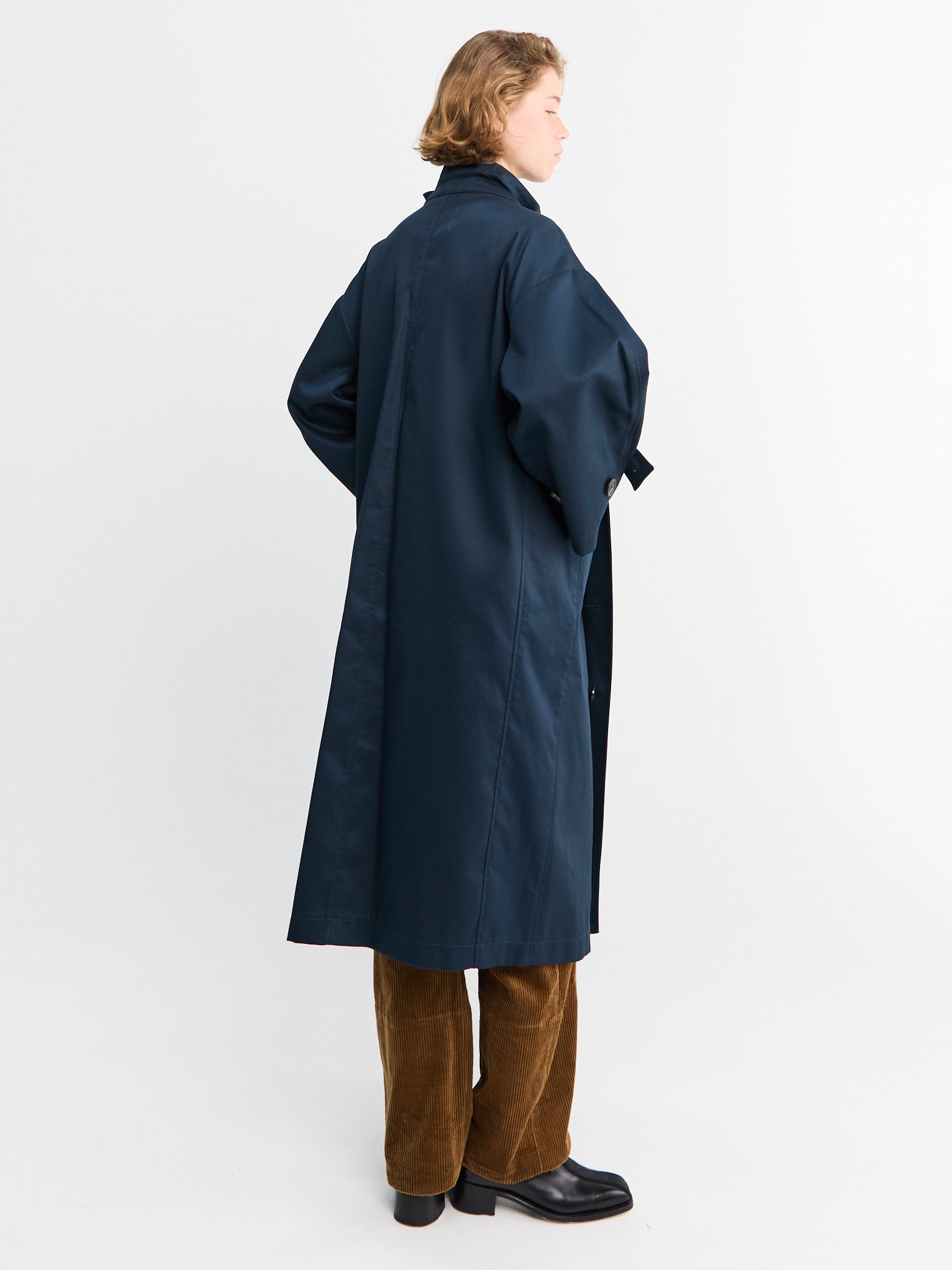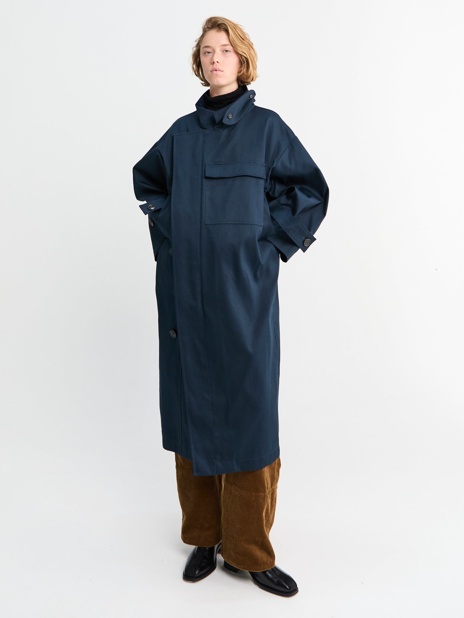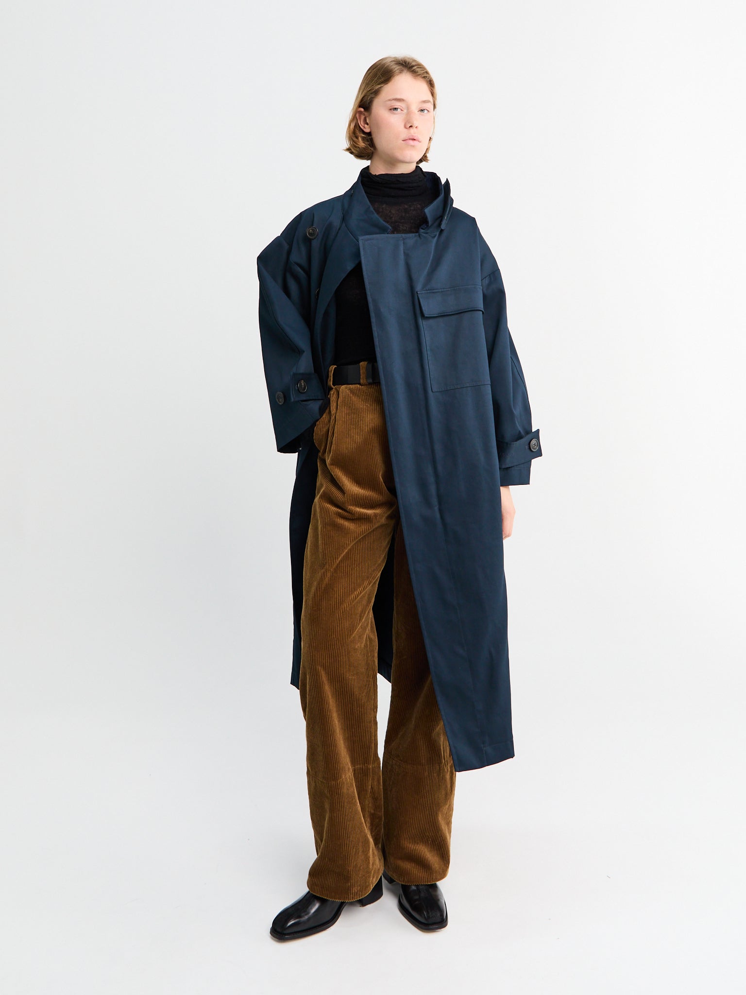 This navy water-resistant coat features a matching corduroy inner collar, side closure with zip and horn buttons, and a large center pocket with two side pockets. Based on the sea officer jacket, it is made from 100% water-resistant cotton twill from British Millerain.