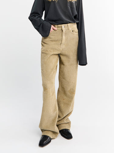 The Full Cut Jeans are crafted from wide-ribbed Italian corduroy, offering a soft texture and relaxed drape. Designed with a high waist and a loose, full-length silhouette, they feature classic five-pocket detailing and a button fly. Finished in the warm, tired teddy wash for a distinctive, vintage-inspired look.