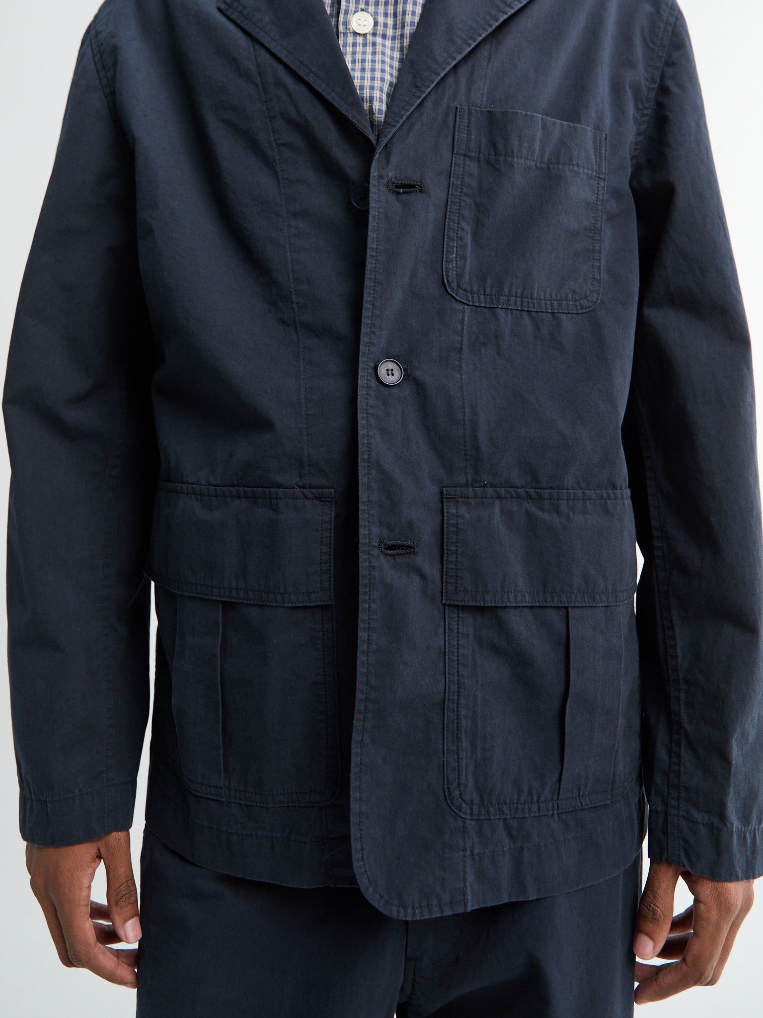 Crafted from premium combed cotton, this jacket delivers a smooth, polished texture with an effortless relaxed fit. The design forgoes shoulder padding for natural movement, while Corozo buttons add sustainable detail. Practical pockets include two front flap styles with box pleats, a chest pocket, and an interior pocket for everyday functionality.