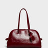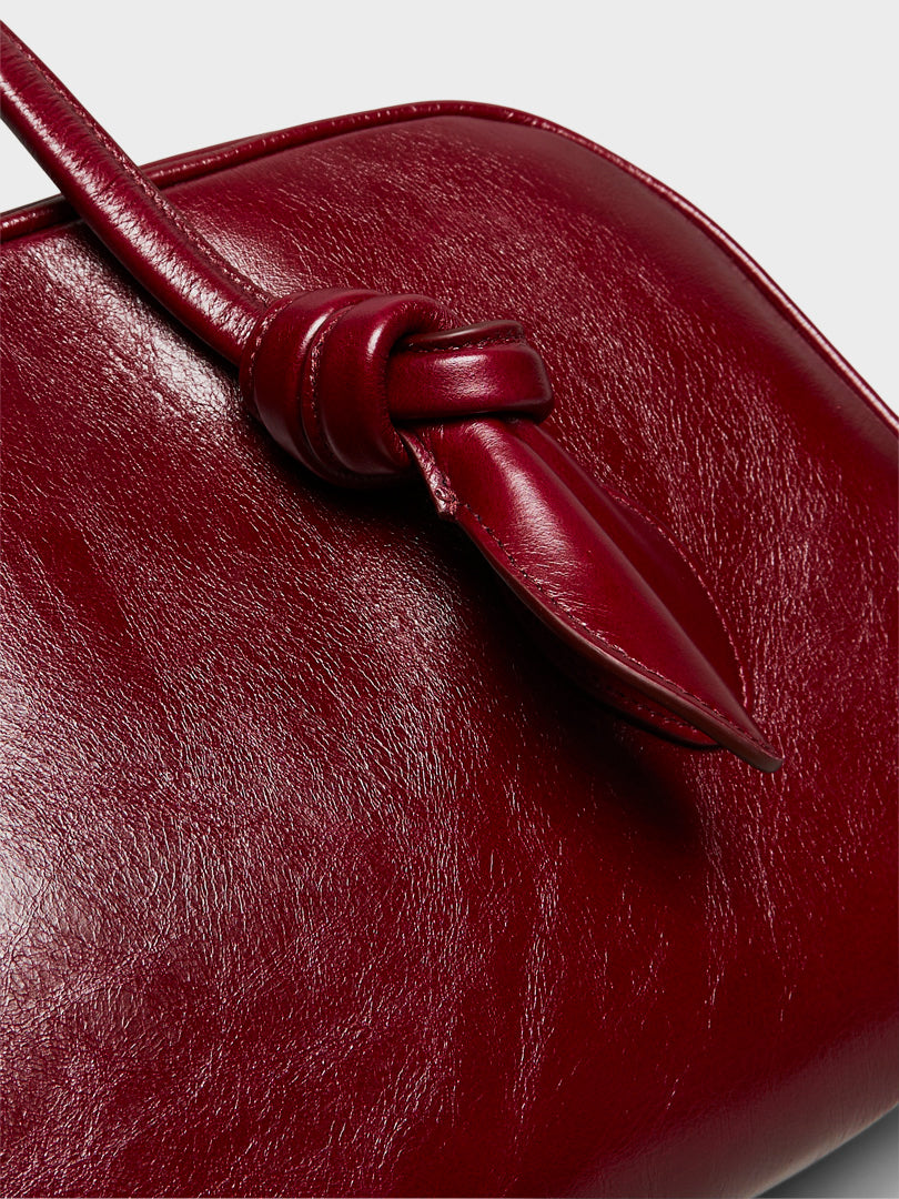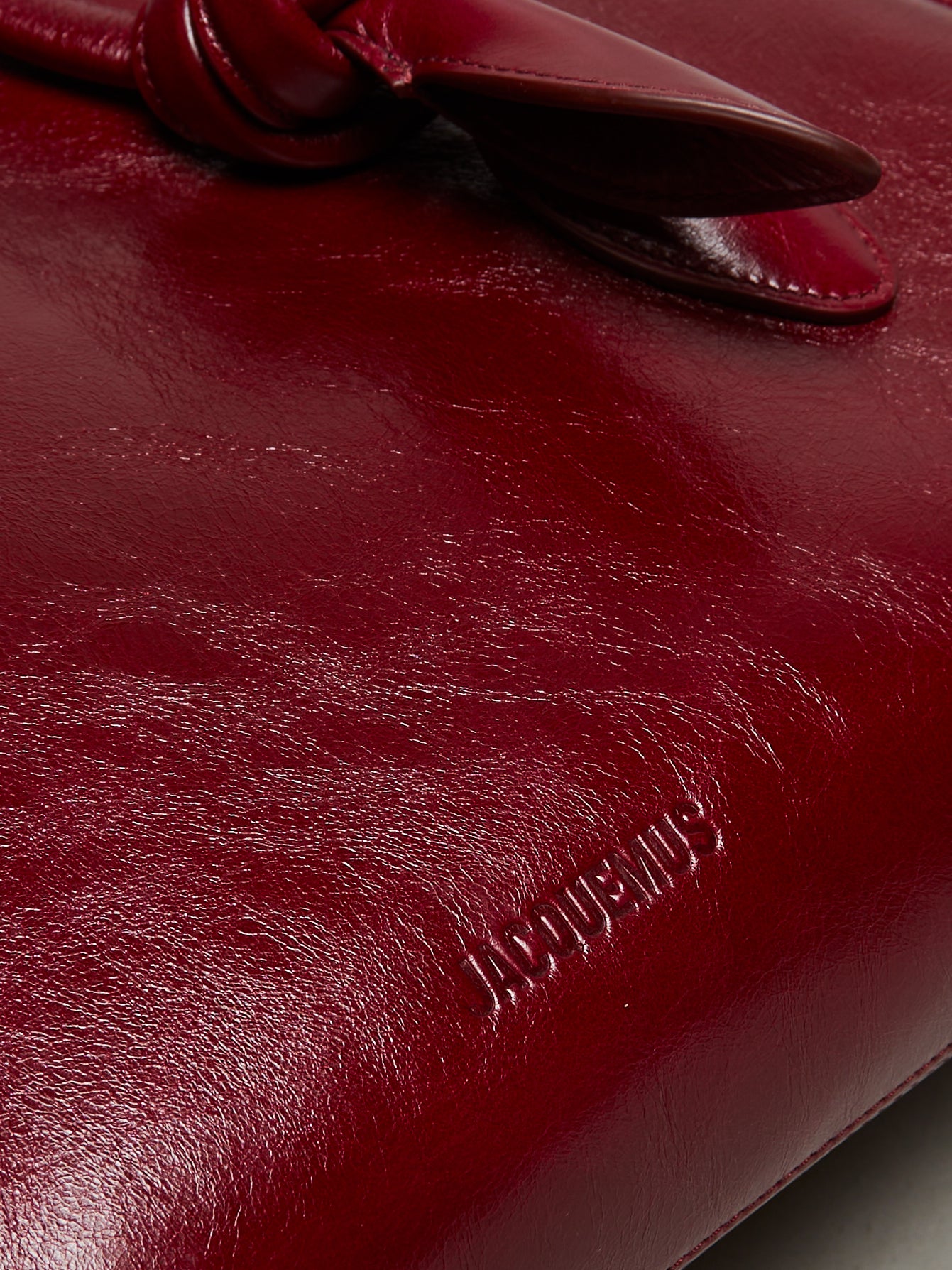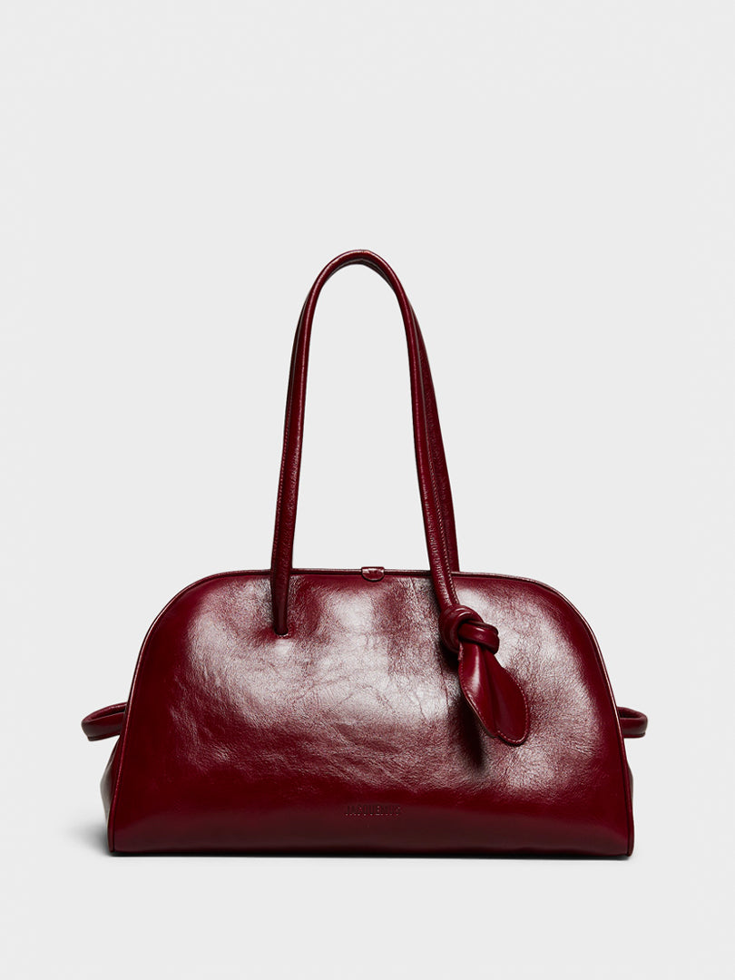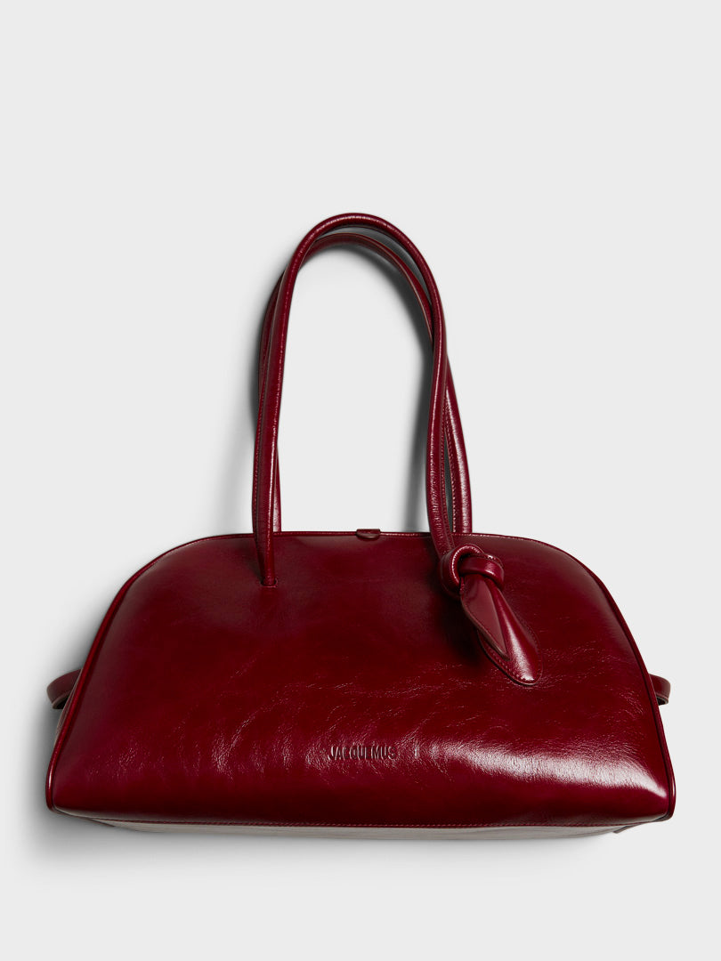 The Turismo Bag by Jacquemus is a soft bowling bag crafted from smooth, shiny leather. It features a two-way zip closure, an inside zipped pocket, and a large patch pocket. A bow detail adds a subtle design element.