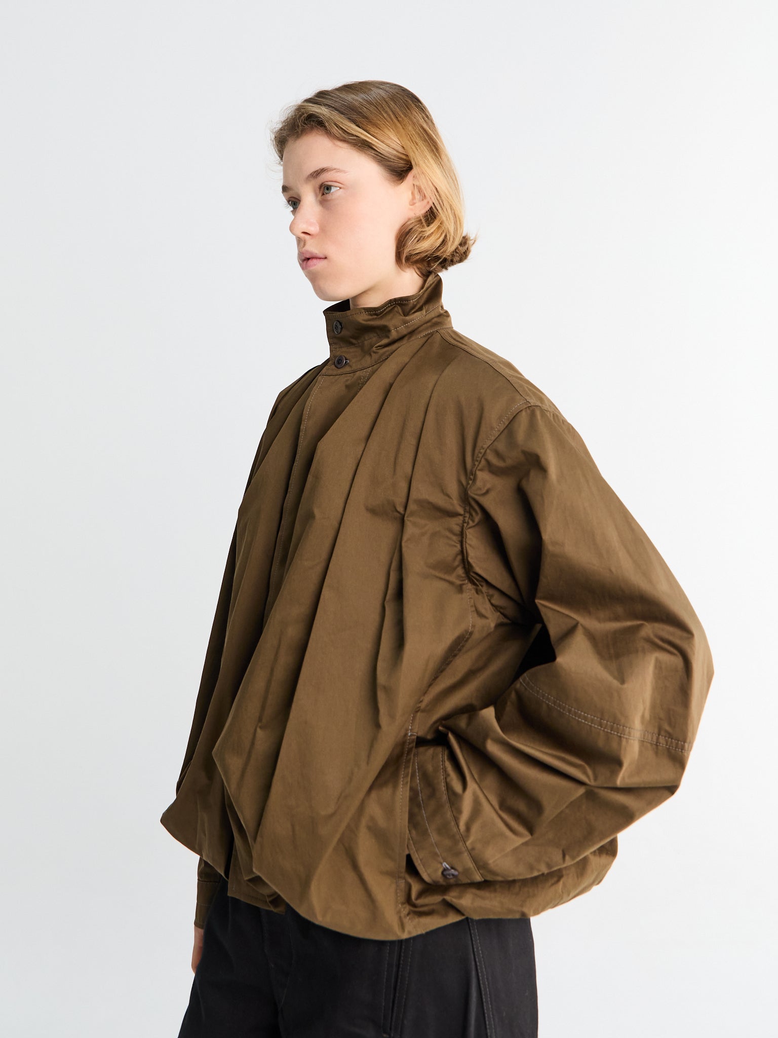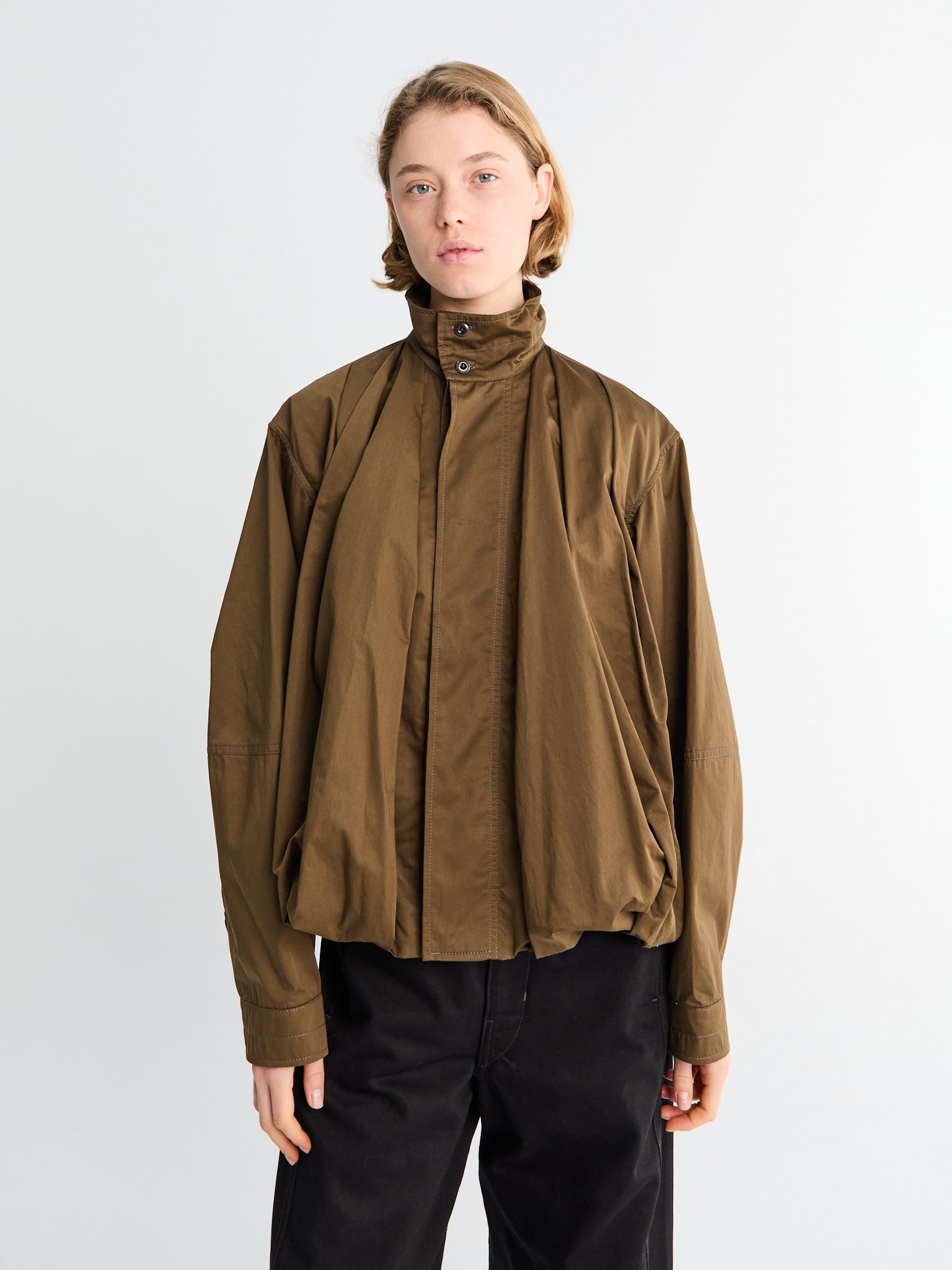 Crafted in a lightweight cotton fabric, it features a softly draped silhouette with subtle volume that creates a relaxed yet sophisticated look. The high stand collar and concealed front closure enhance the clean, minimalist expression. Finished with a gently rounded shape, this jacket is a timeless outerwear piece that reflects Lemaire’s understated, modern aesthetic.