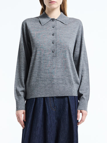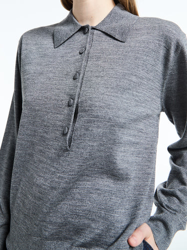 The Tuno Polo in Grey features long sleeves and is crafted from merino wool knit, complete with a traditional collar and a buttoned chest placket, making it a timeless and elegant design.
