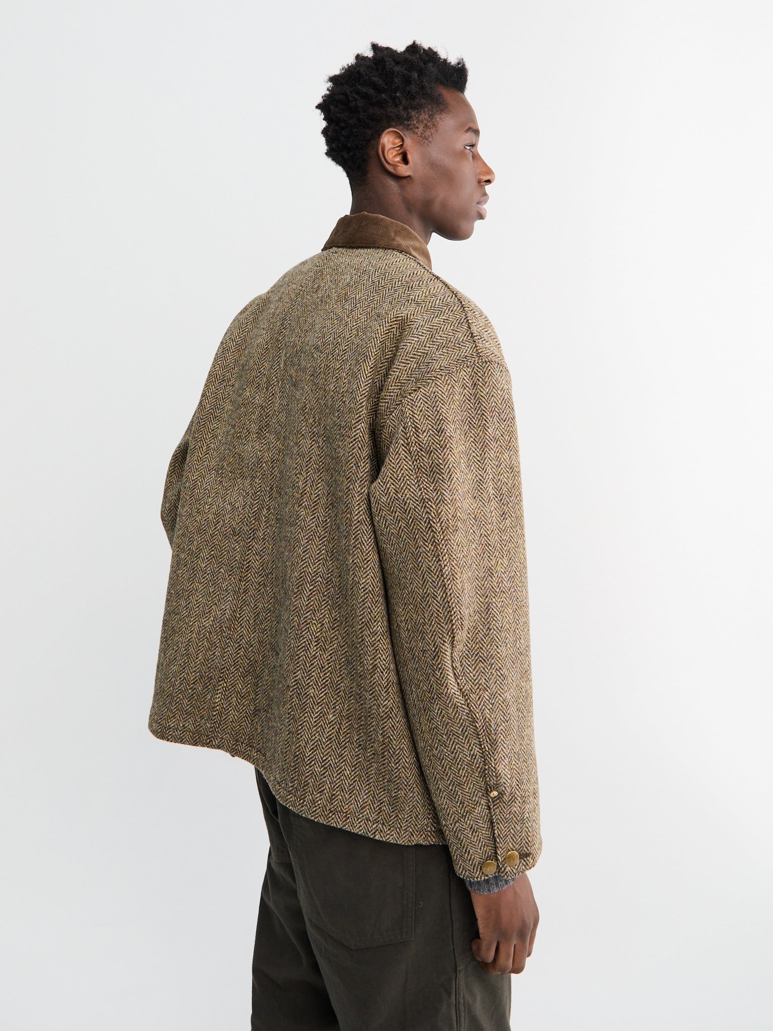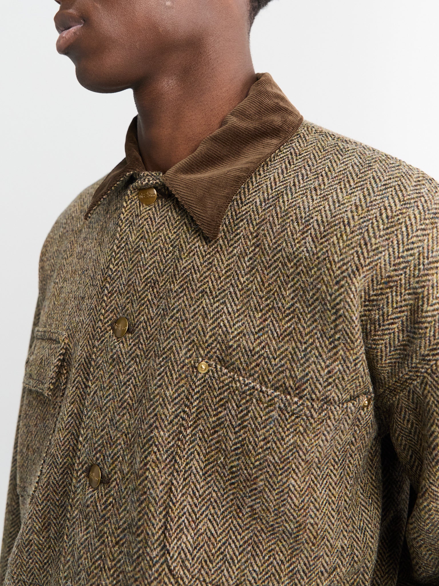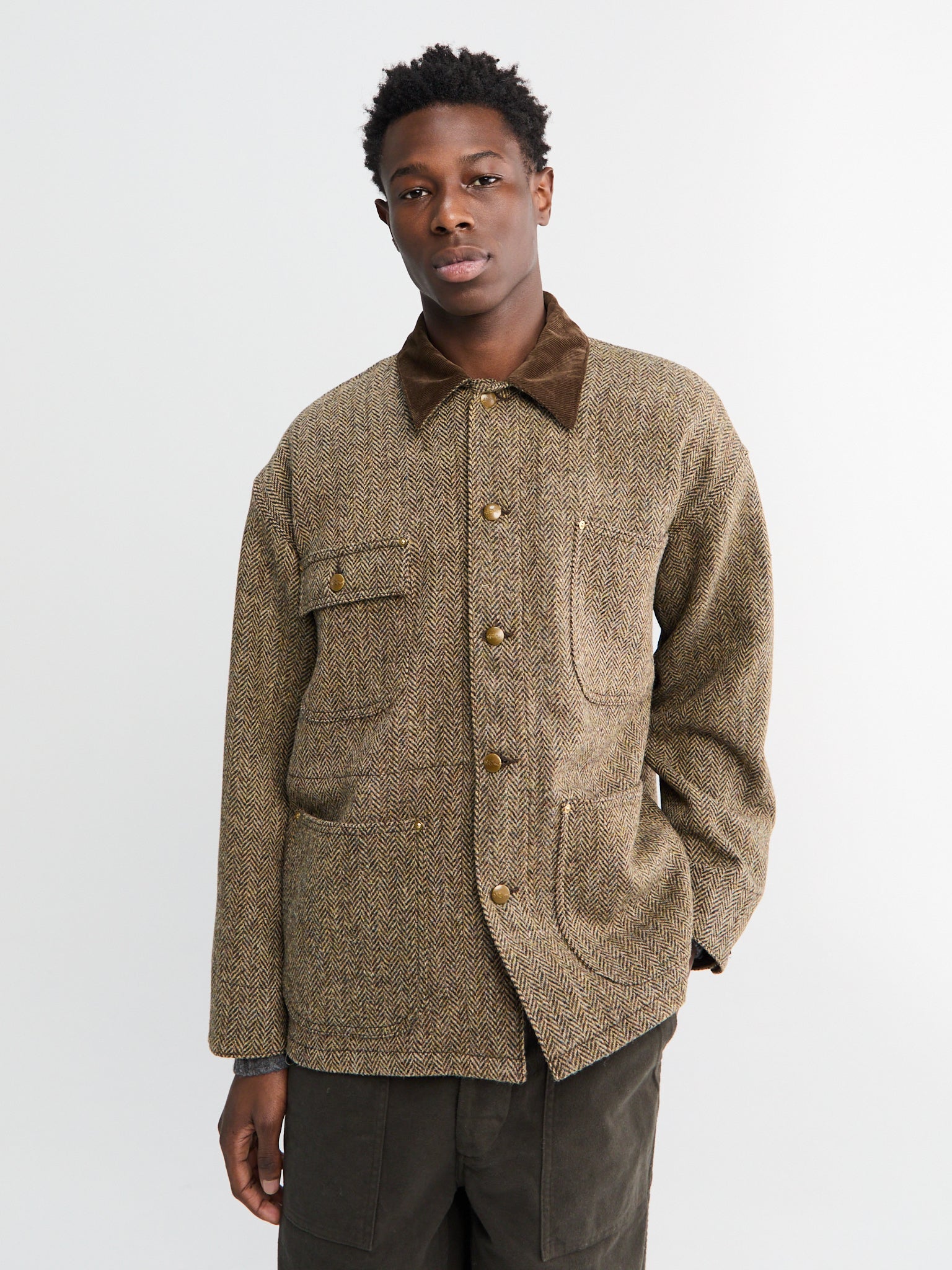 Crafted from genuine Harris Tweed wool, the Khaki Coverall Shirt by Orslow combines durability with classic style. It features a soft cotton corduroy collar, a branded button closure, and four practical front pockets, making it a versatile and functional piece