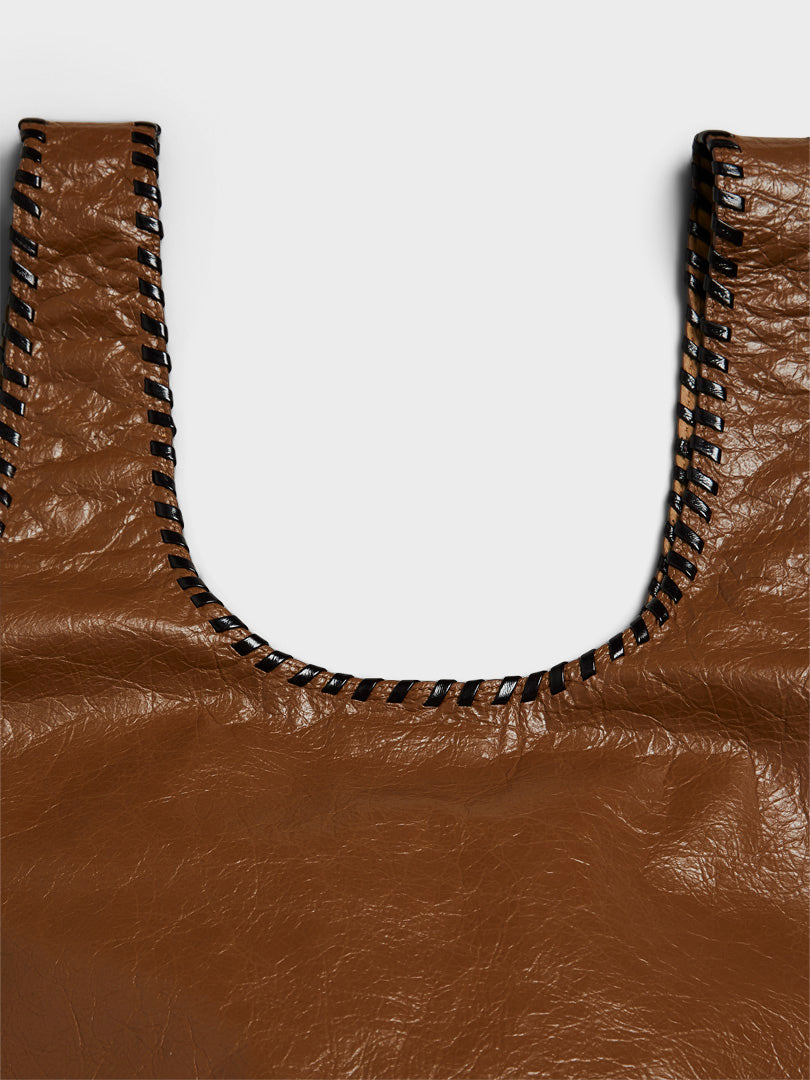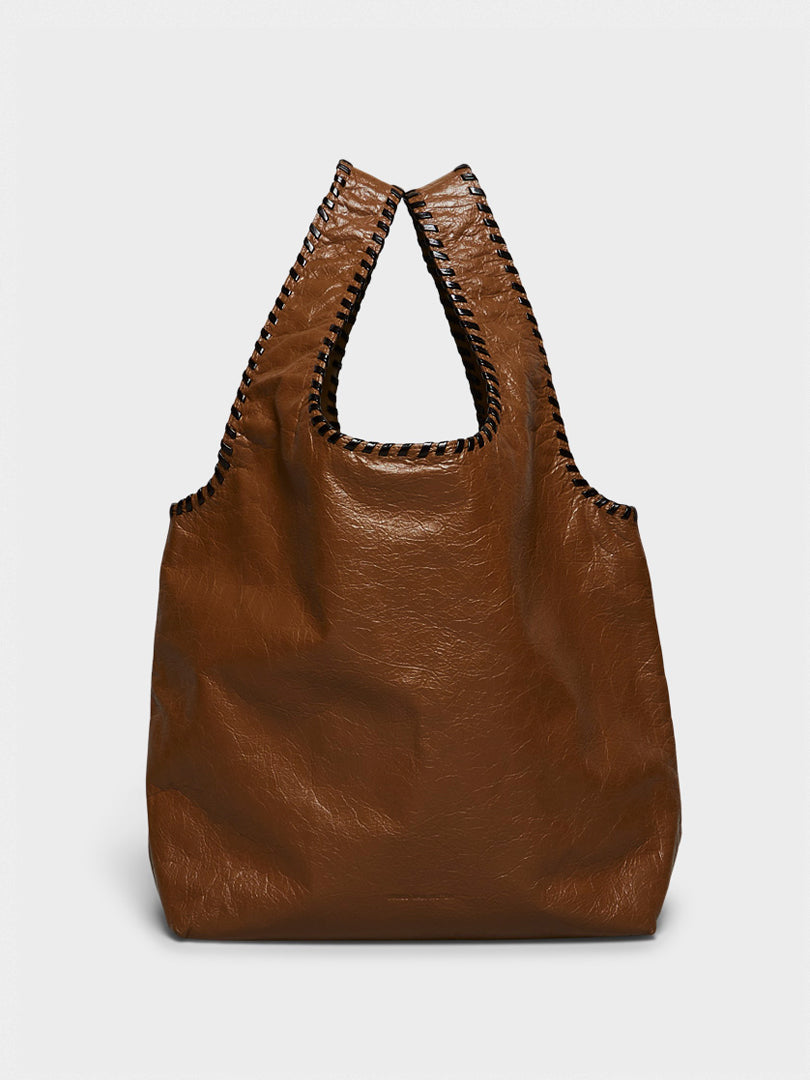 This Large Leather Tote Bag in Tan offers a generously sized interior. Crafted from durable leather, it features detailed stitching that adds subtle texture and style. The shoulder-length handles allow for comfortable carrying, making it a practical choice for daily use.