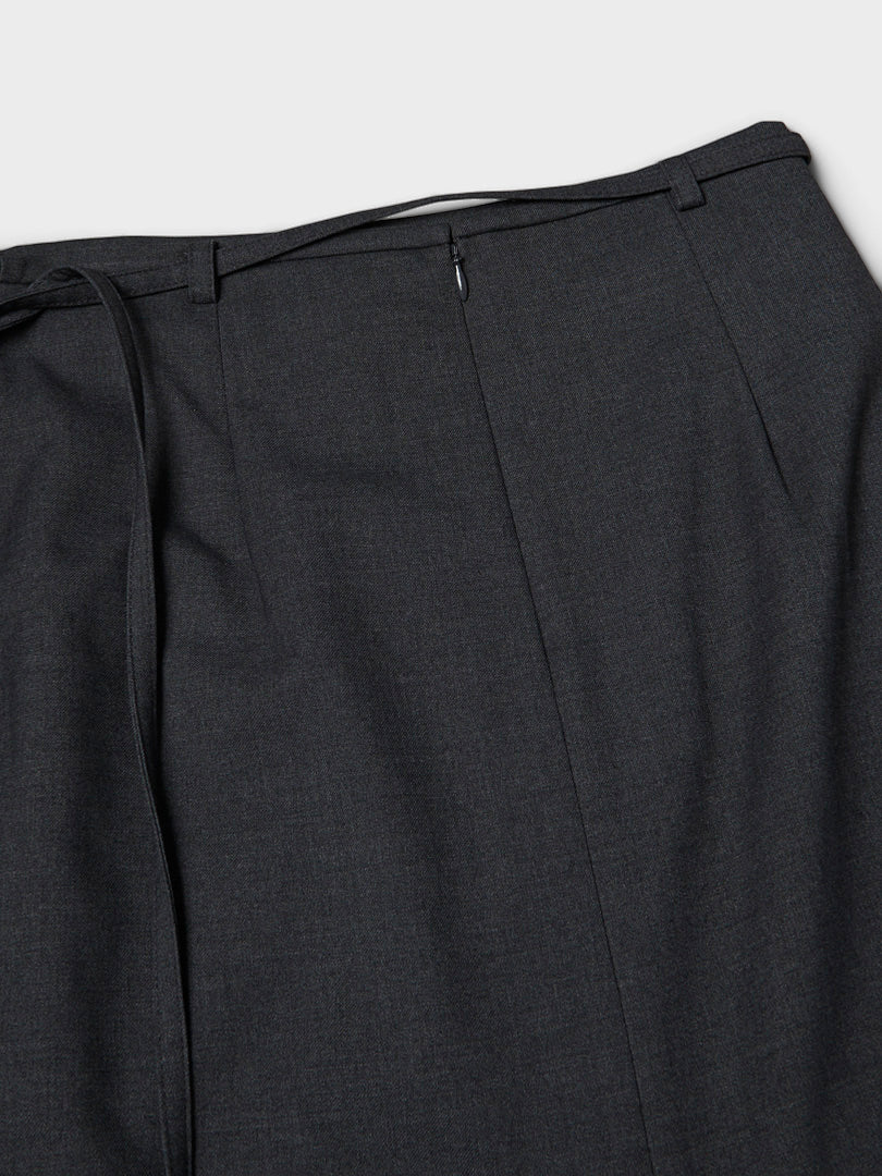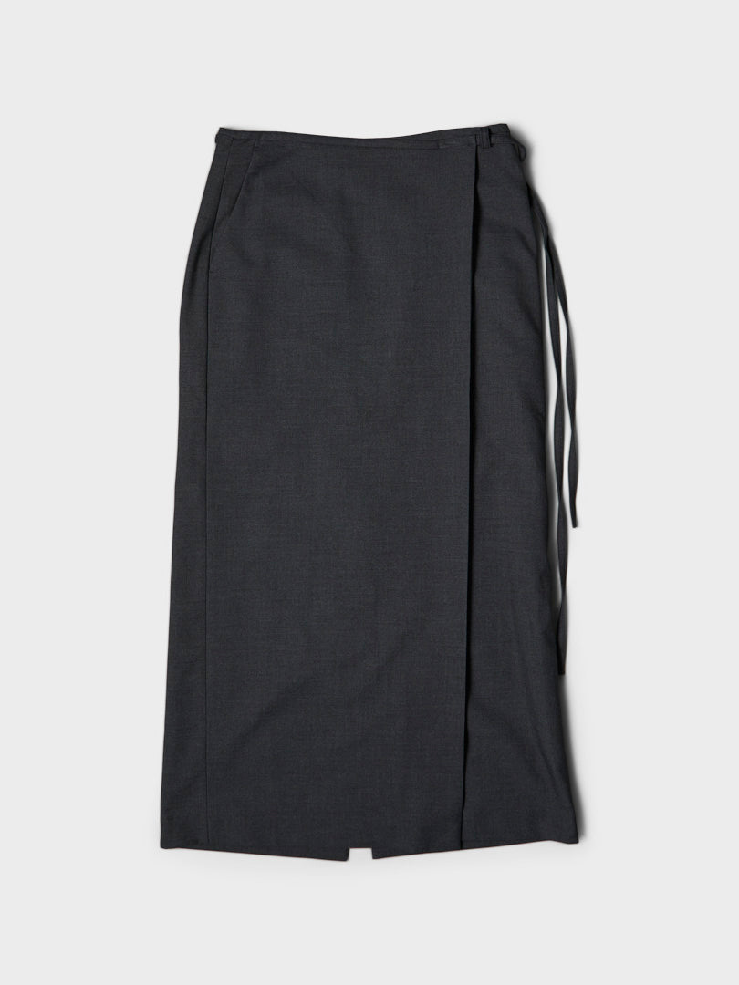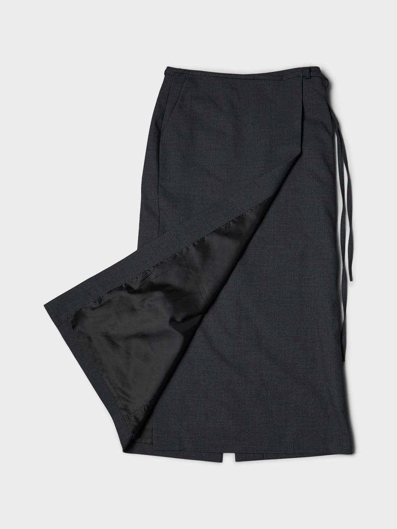 This maxi wrap skirt in charcoal grey is crafted from a structured, medium-weight fabric. Its clean silhouette is defined by a wrap-front construction and secured with long, adjustable side ties for a personalized fit.