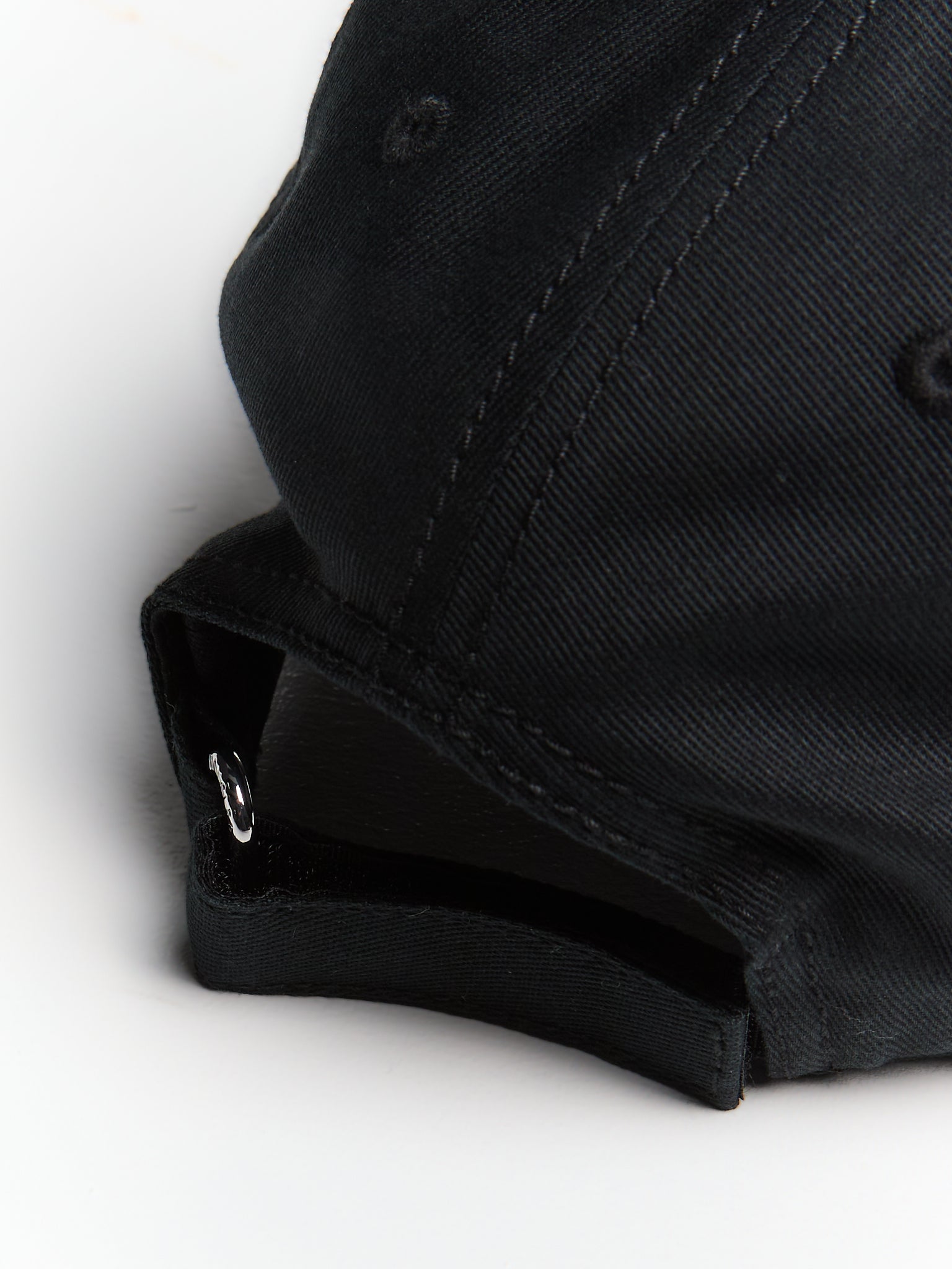 Classic black baseball cap made from durable cotton gabardine with a soft canvas lining. Features an embroidered logo and adjustable back strap for a comfortable, customizable fit.