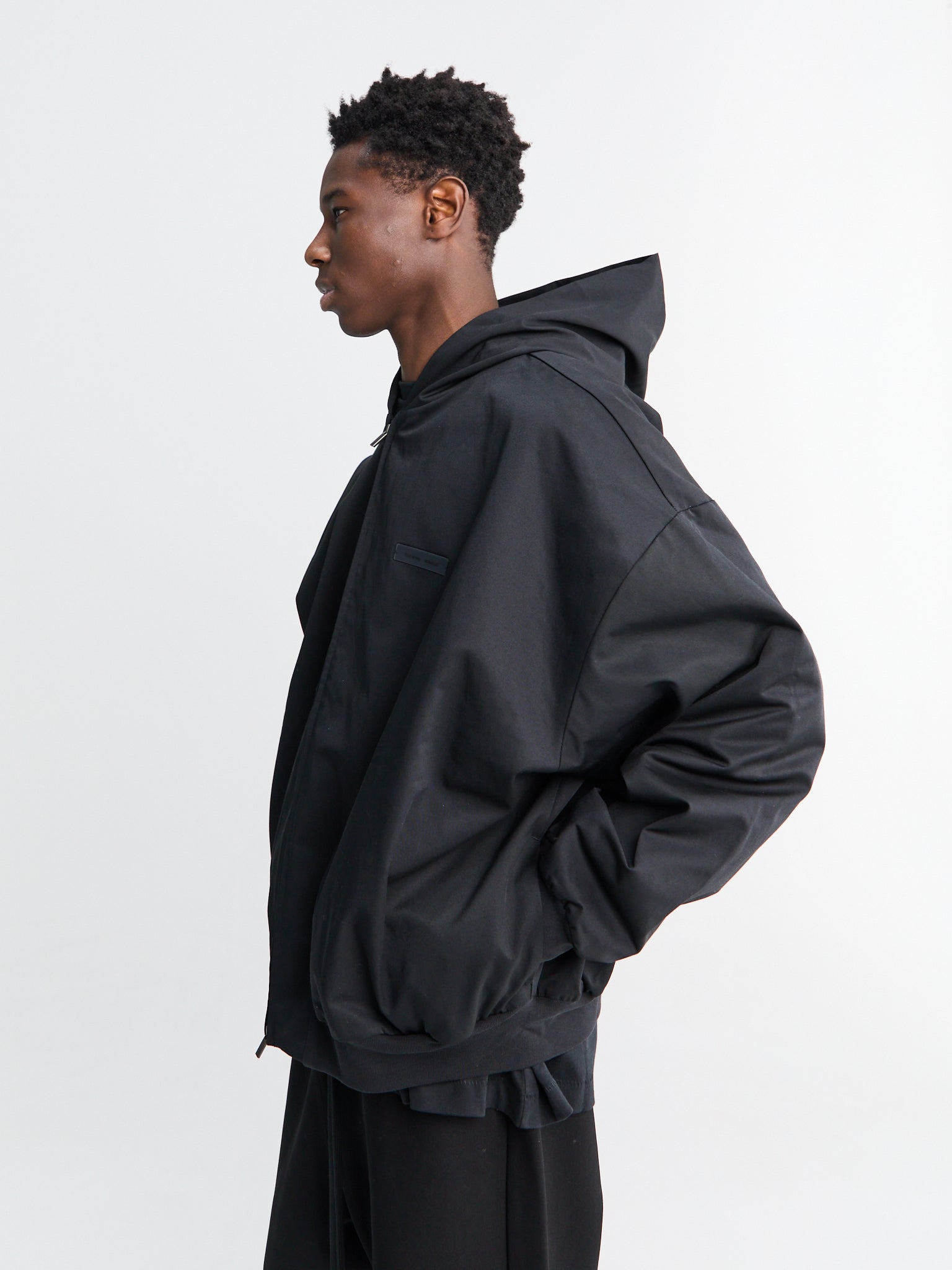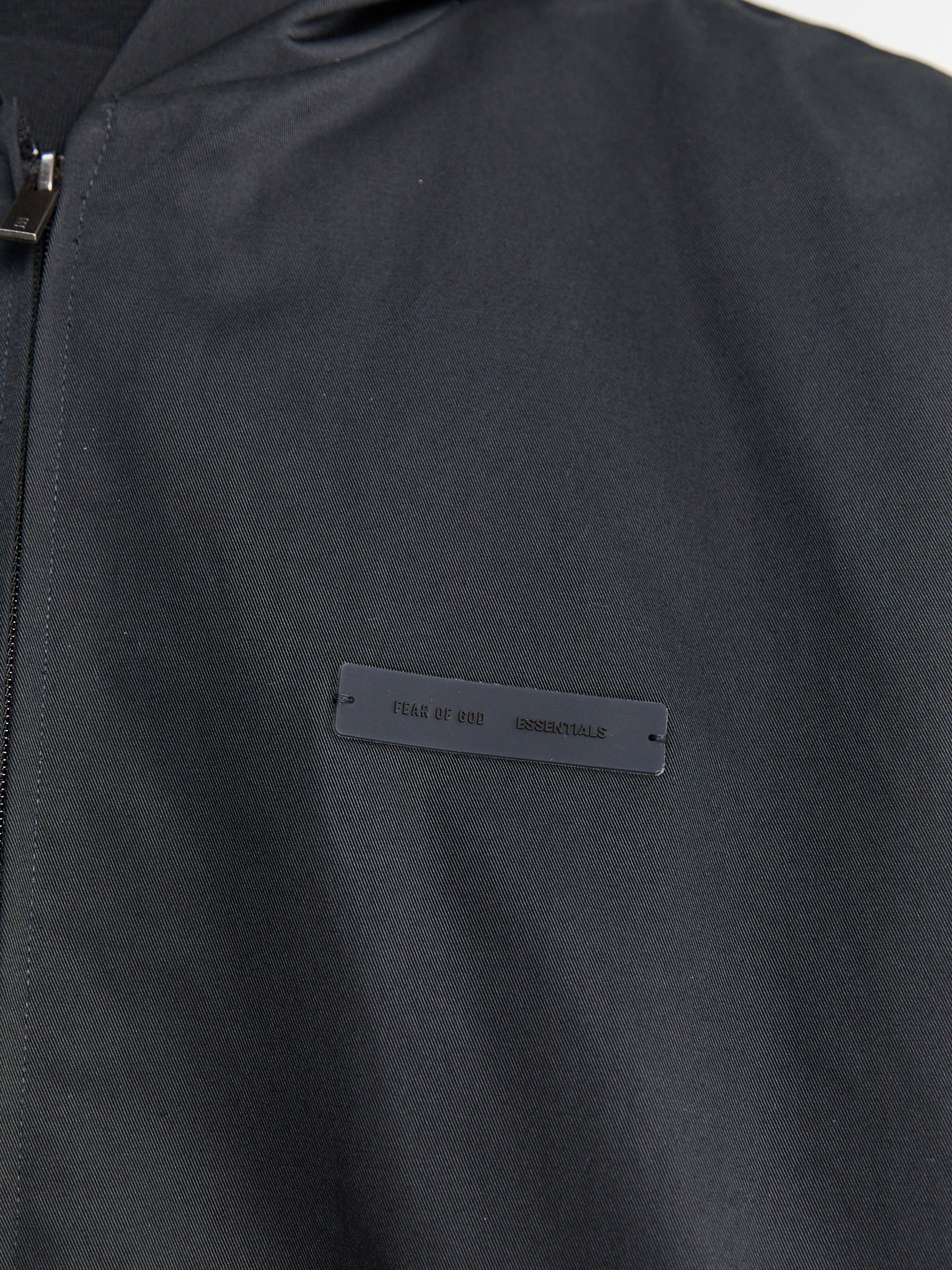 Hooded Bomber in cotton/polyester twill with a boxy, cropped fit. Features a double-layer hood, full front zip, and side pockets. Classic Fear of God Essentials labels on the chest and hood.