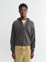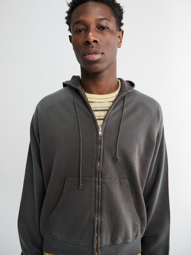 Hooded sweatshirt made by a Pima cotton fabric. Using premium raw materials and vintage machinery, the fabric achieves a distinctive lightweight feel with natural stretch. Once sewn, it is garment-dyed to develop a rich, lived-in colour and texture, giving it the character of years of wear