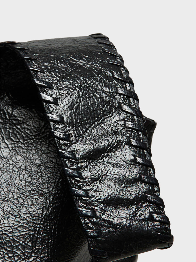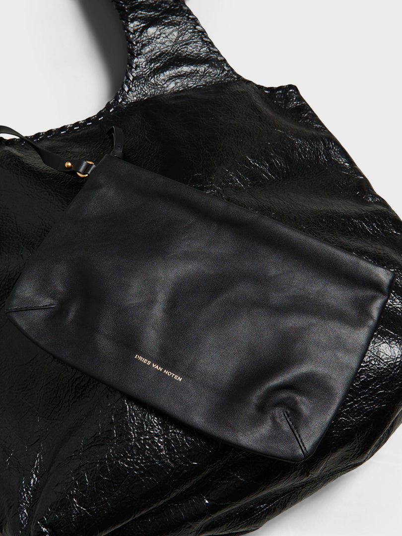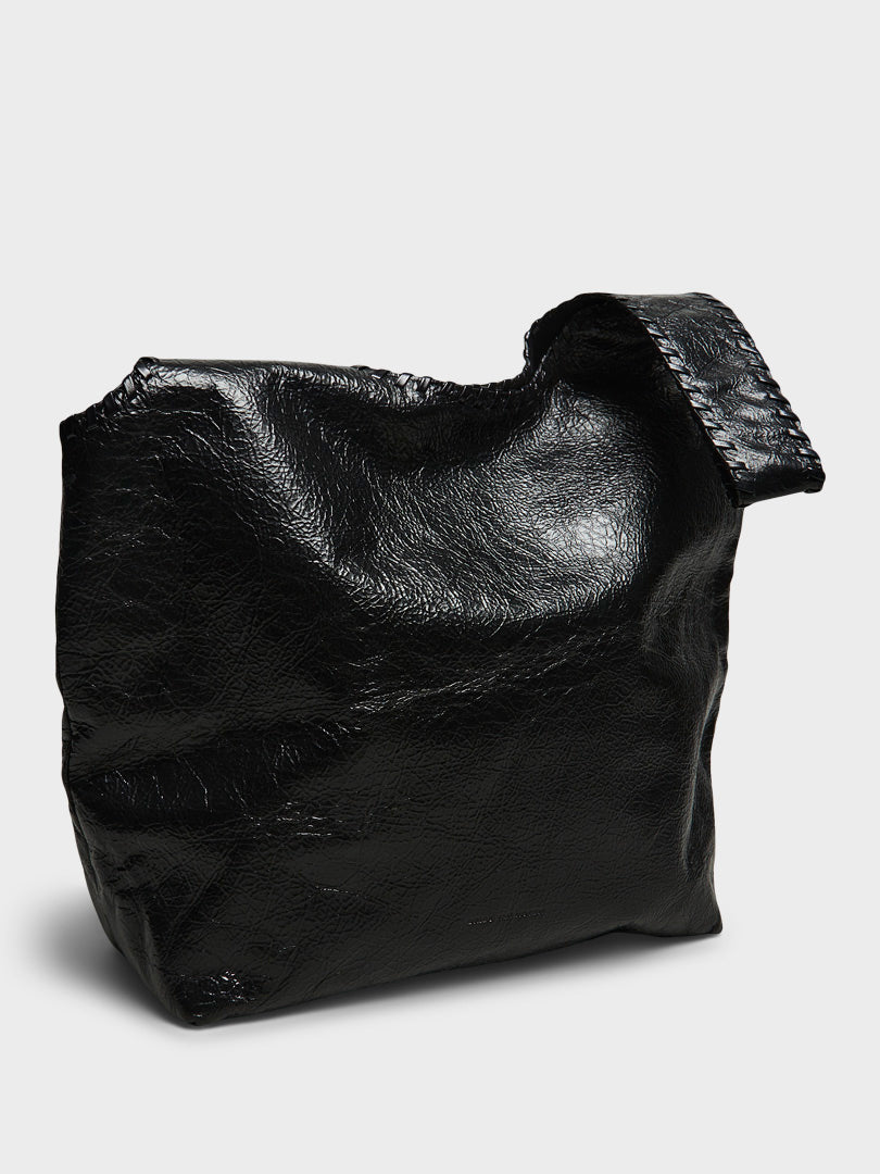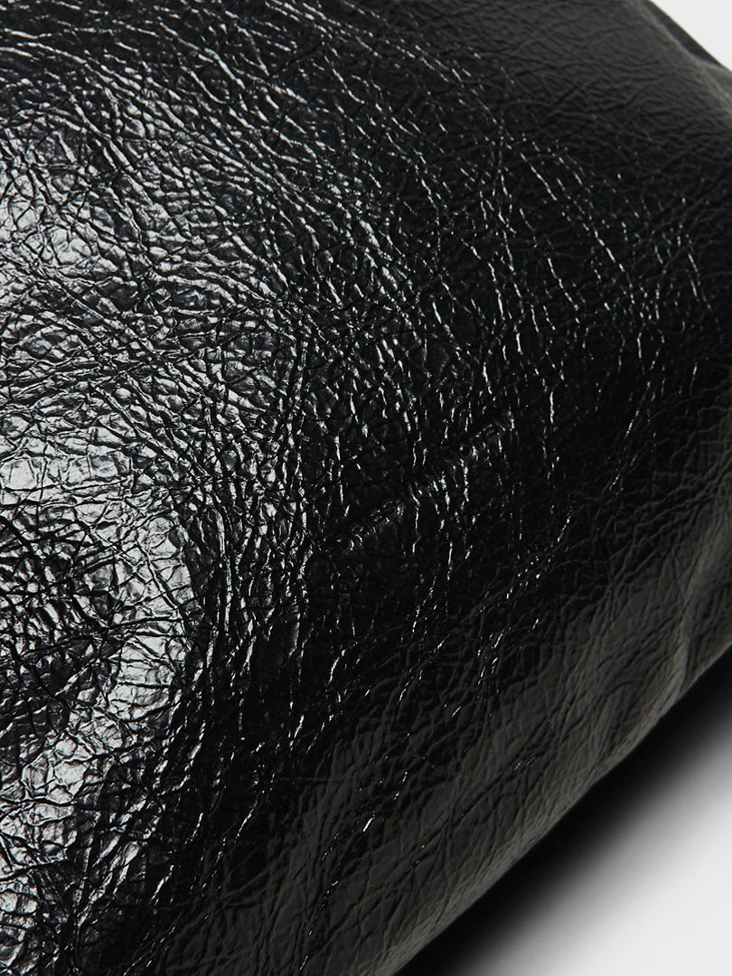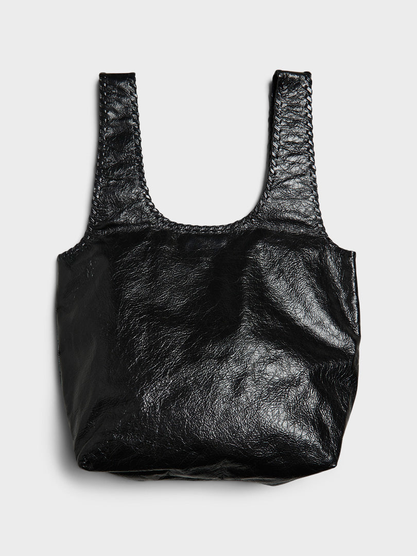 This Large Leather Tote Bag in Black offers a generously sized interior. Crafted from durable leather, it features detailed stitching that adds subtle texture and style. The shoulder-length handles allow for comfortable carrying, making it a practical choice for daily use.