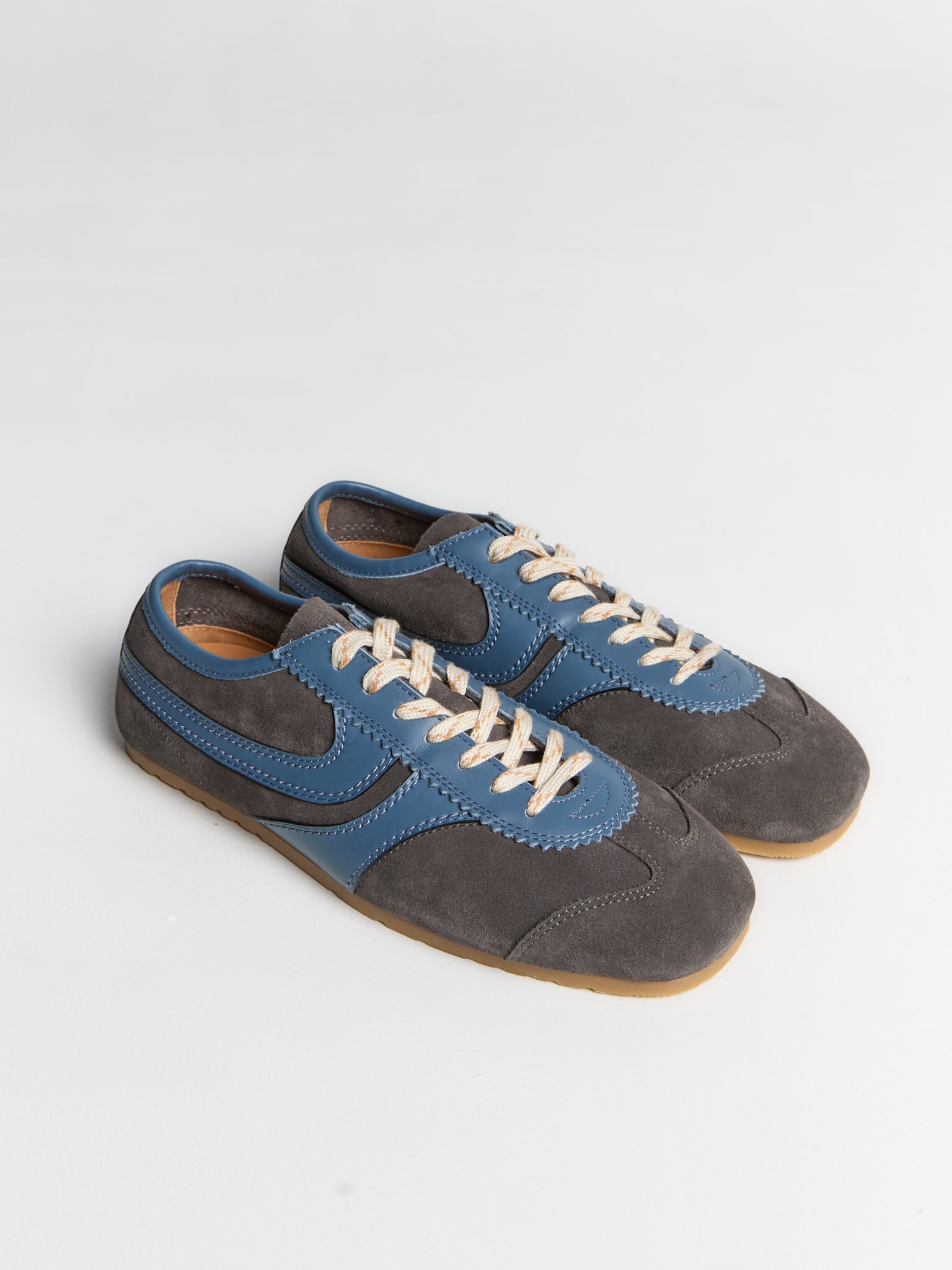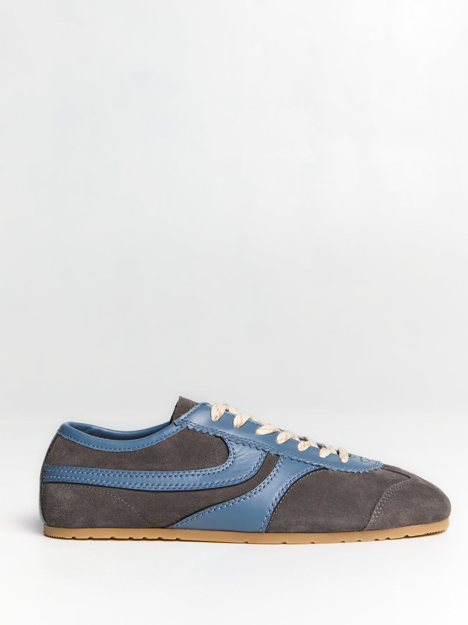 These sneakers are crafted from soft suede in a steel grey hue, with a paneled upper defined by smooth leather trims. The silhouette is set on a classic rubber sole.