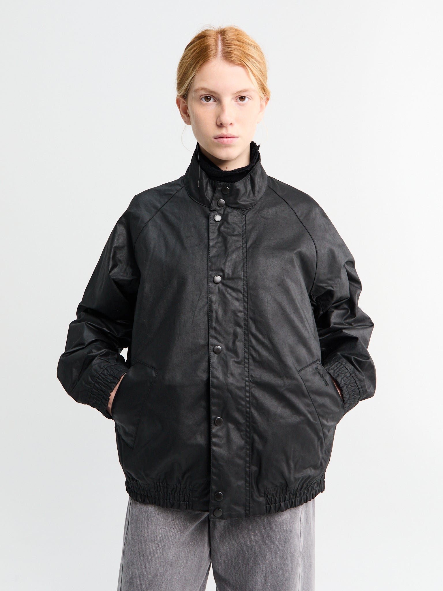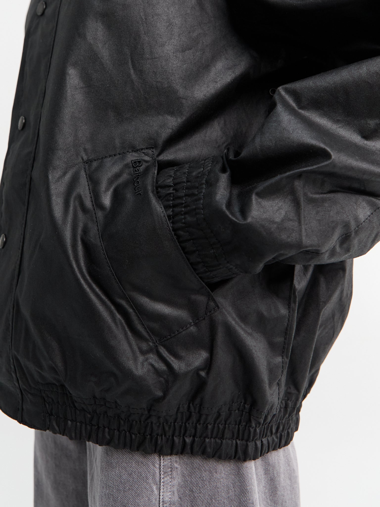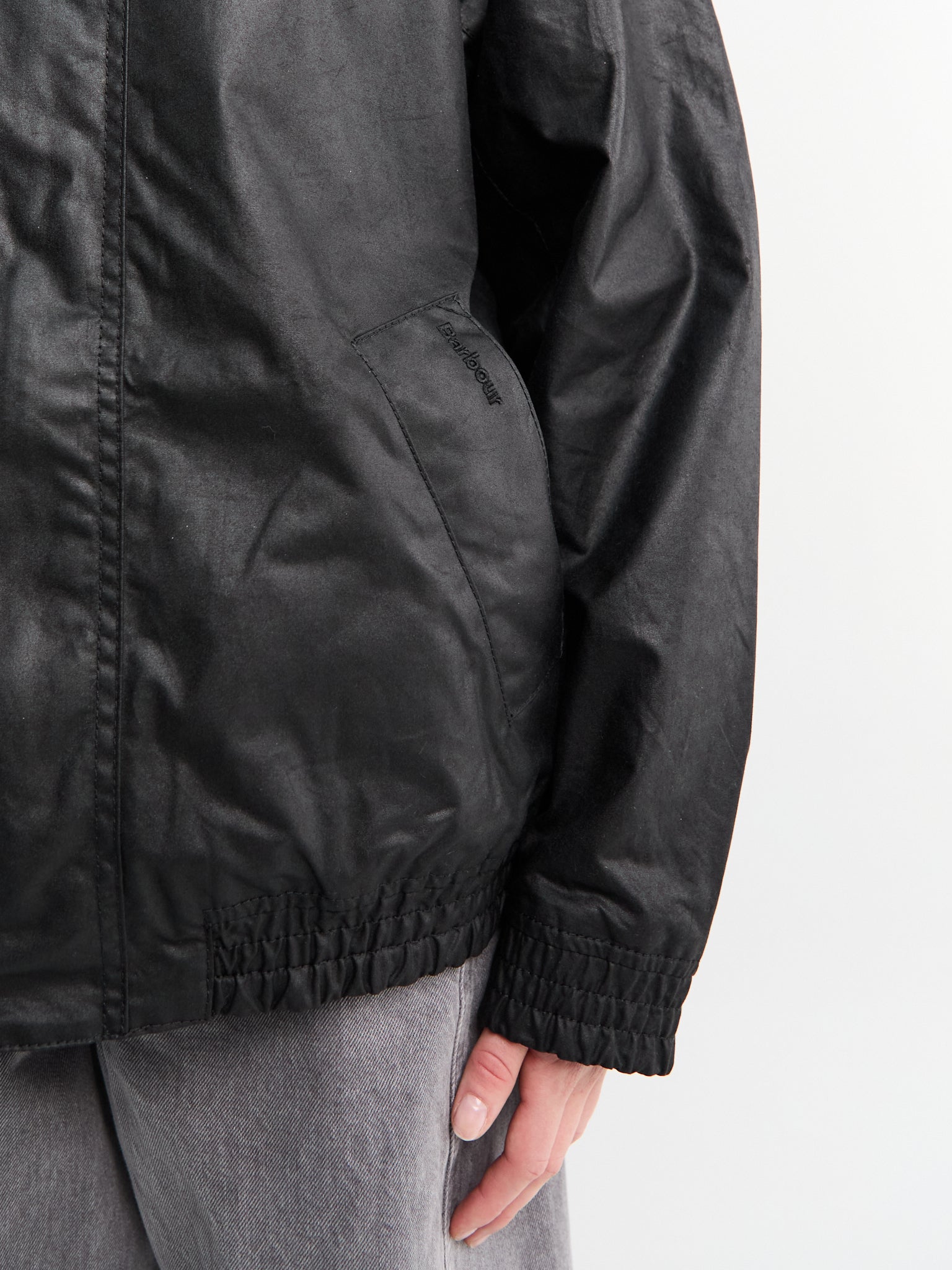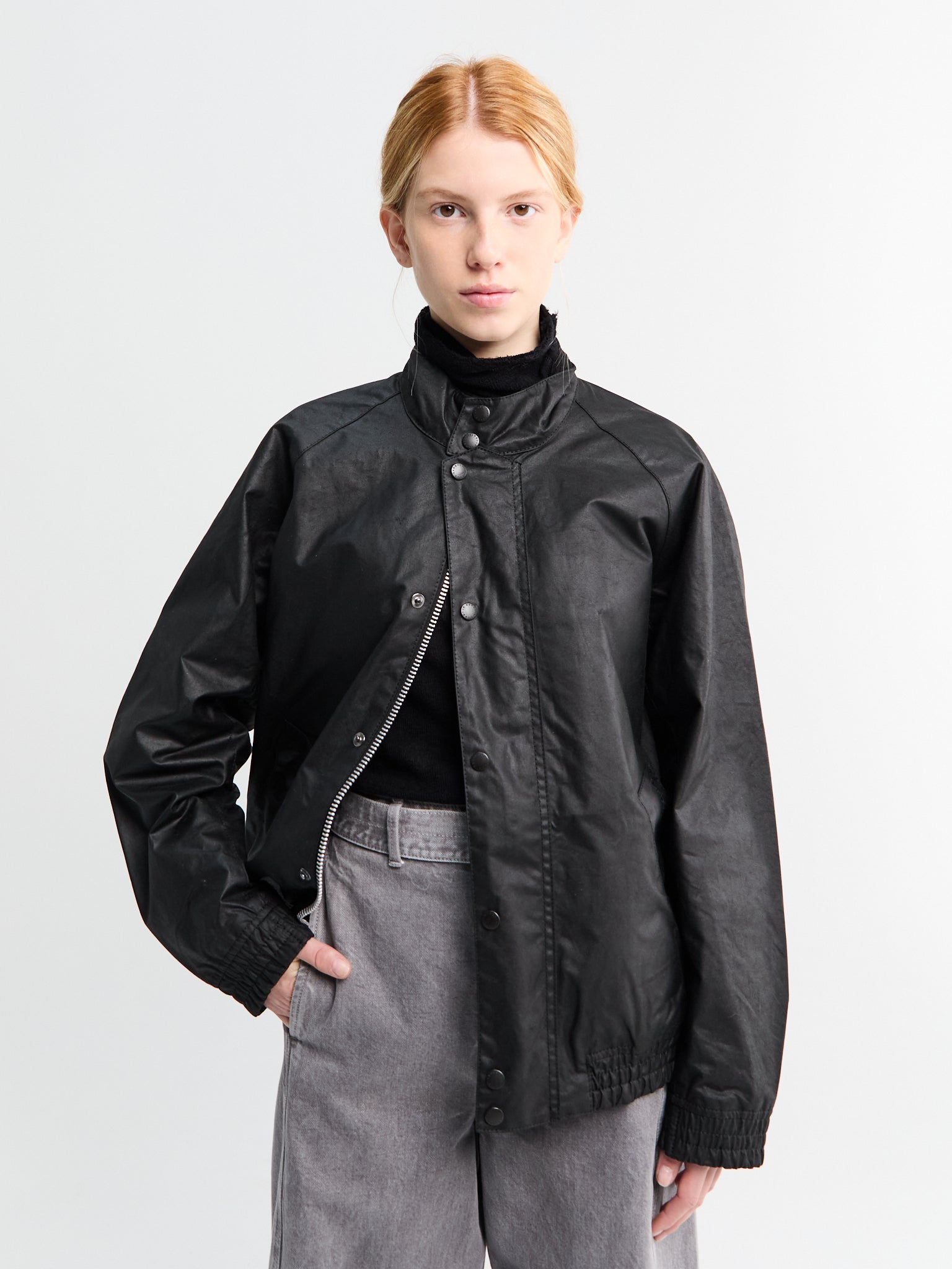 Drawing inspiration from the classic Transport Jacket, the Blouson Transport Waxed Jacket features a contemporary design. It includes a stand-up collar, storm flap, elasticized cuffs and hem, a concealed zip closure, and traditional weatherproof elements.