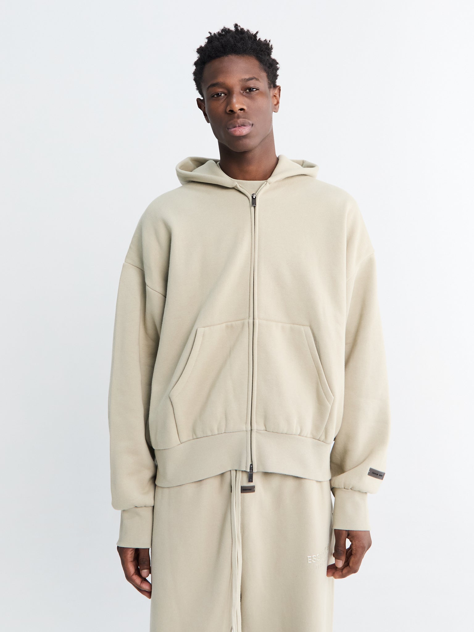 Classic zip hoodie in mid-weight core fleece. Features a double-layer hood, front pockets, and ribbed trims. Finished with a beveled metallic Essentials logo on the back and rubberized labels on the hood and sleeve.