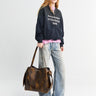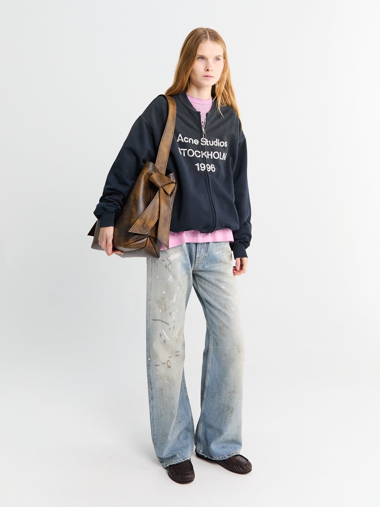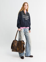 This ochre yellow Musubi shoulder bag features distinctive musubi knots on either side. Constructed from supple leather with intentional aging treatment, it combines refined craftsmanship with understated elegance. The design includes an adjustable shoulder strap for versatile carrying, an interior zip pocket with branded lanyard detail, and the signature embossed Acne Studios logo. A secure snap button closure completes the piece.