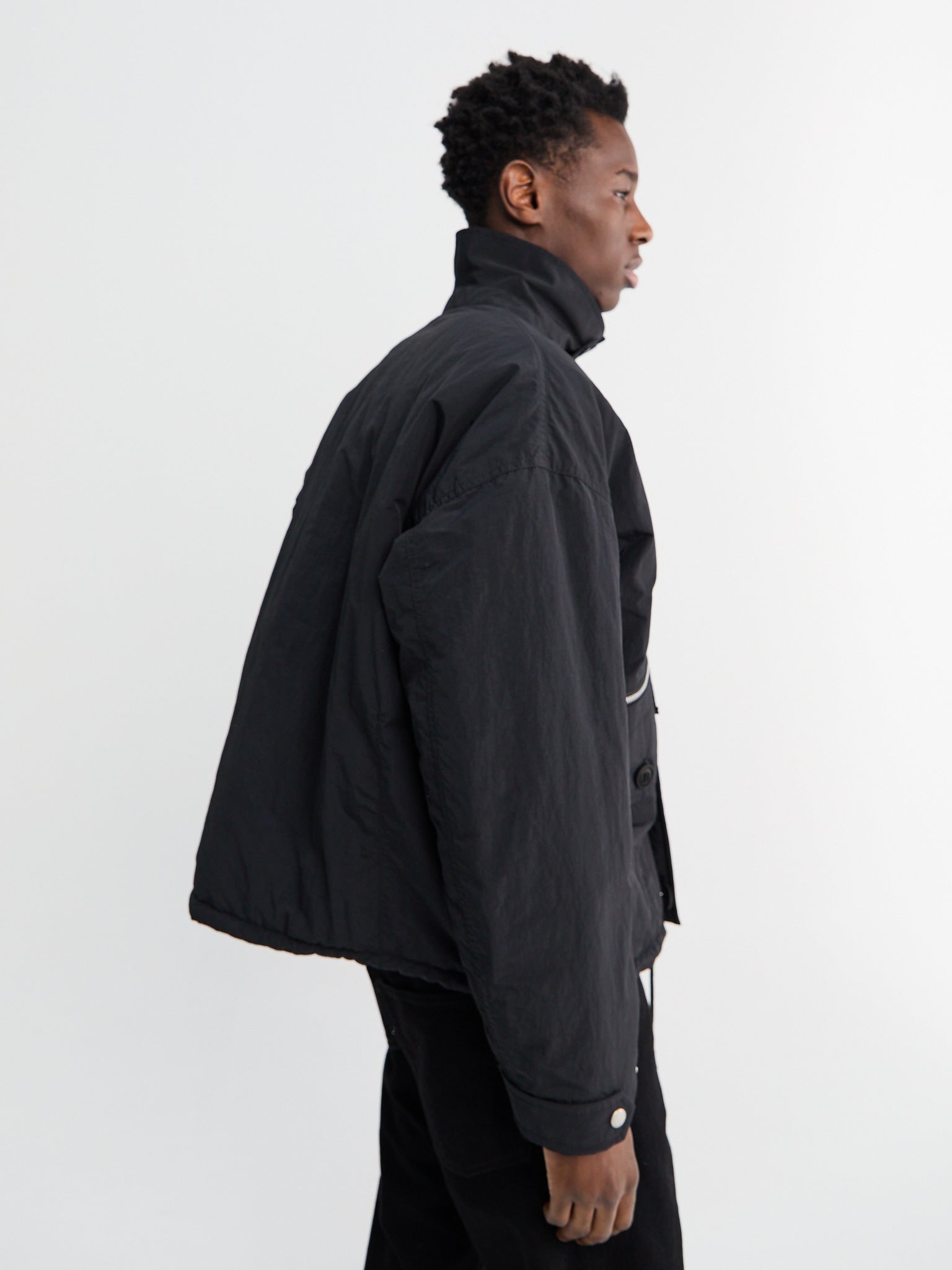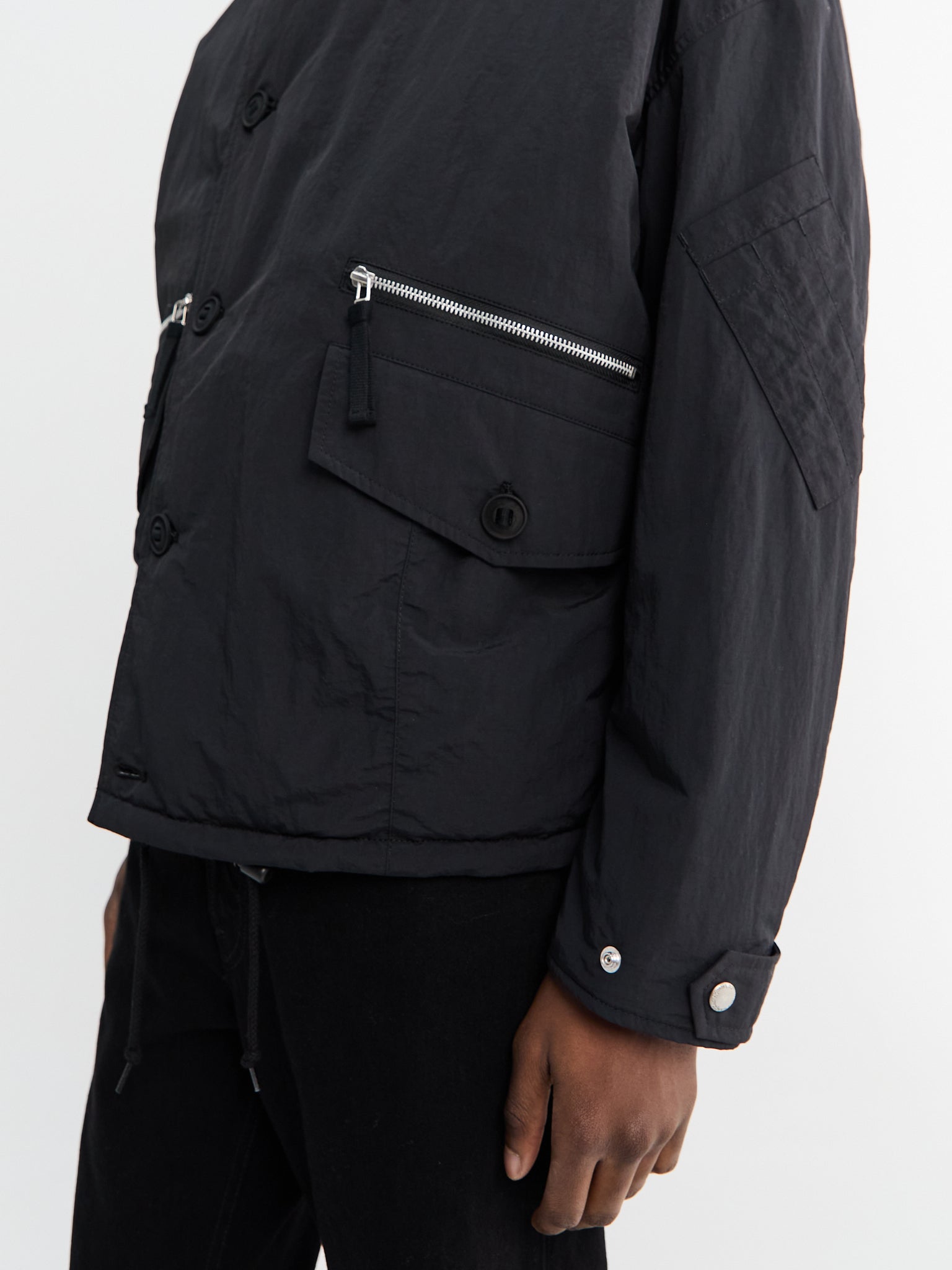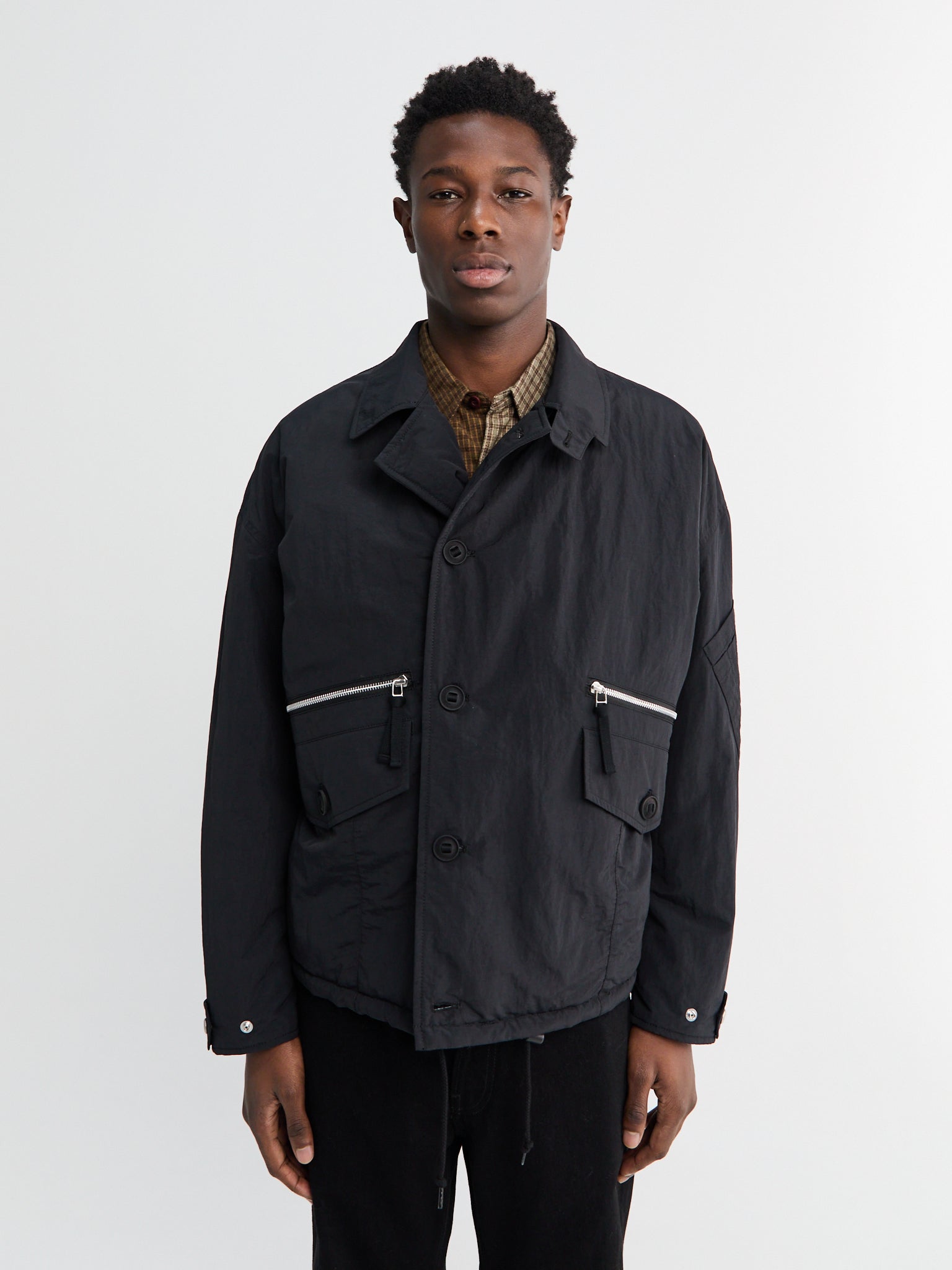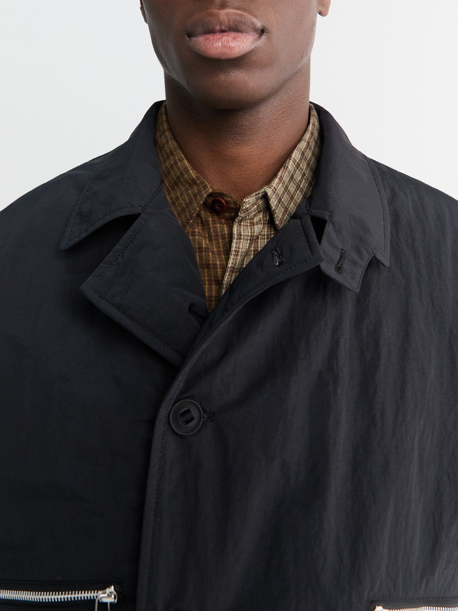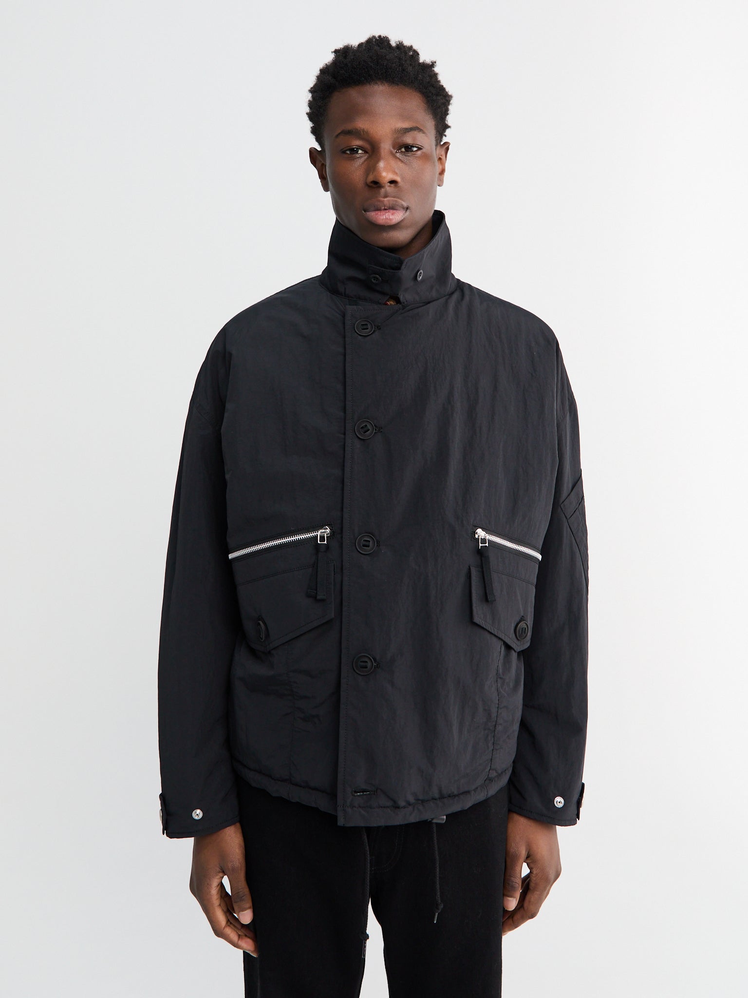 This jacket blends utilitarian design with contemporary refinement. Crafted from lightweight nylon, it features an asymmetrical button closure, functional zip and flap pockets, and adjustable cuffs for a structured yet versatile silhouette. Subtle tailoring details and premium construction reflect the brand’s signature fusion of practicality.