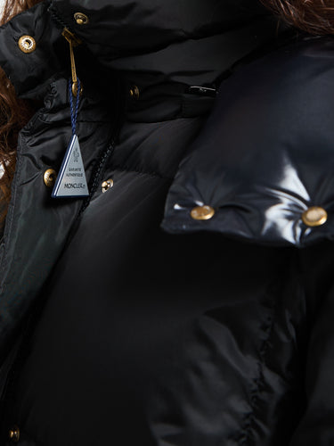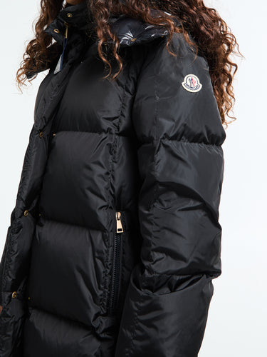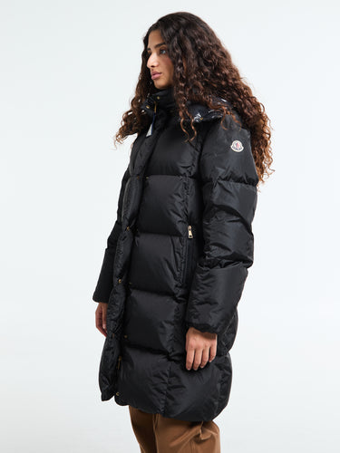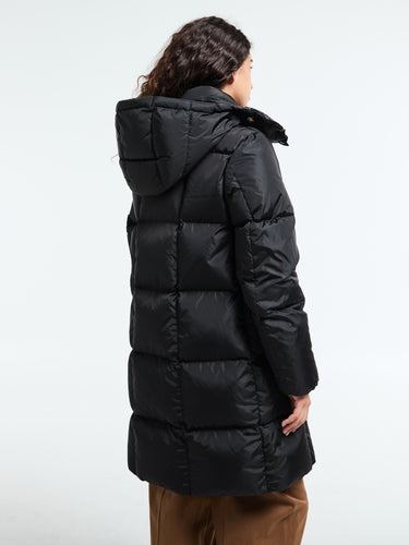 The Litte Long Coat for women is an elegant essential for colder weather, featuring geometric quilting and a sleek satin finish. The coat is down-filled for warmth and features a detachable, adjustable hood. The front has a zip and snap button closure, zipped pockets, and elastic cuffs for a secure fit.