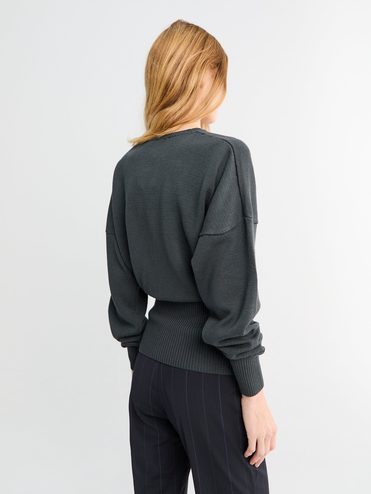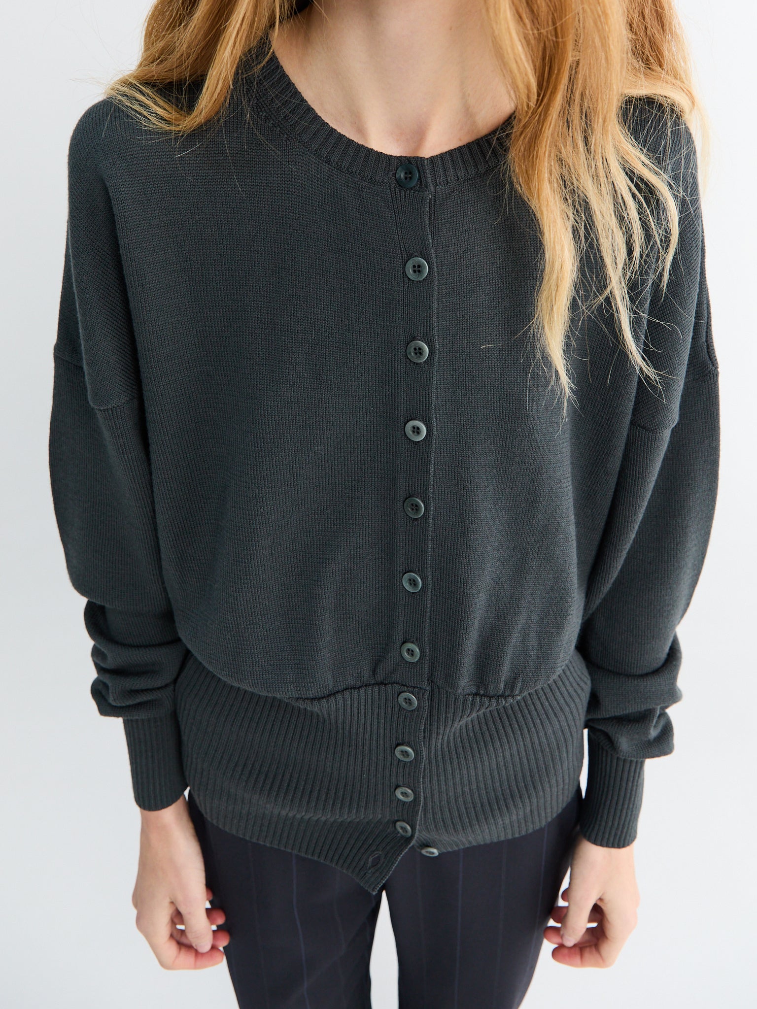 The cardigan is made from fine merino wool. It features button closure, round neckline and rib knit at the cuffs and hem