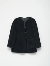 This black lambskin shearling coat features a front button closure and is reversible, offering two sophisticated and elegant looks in one garment.