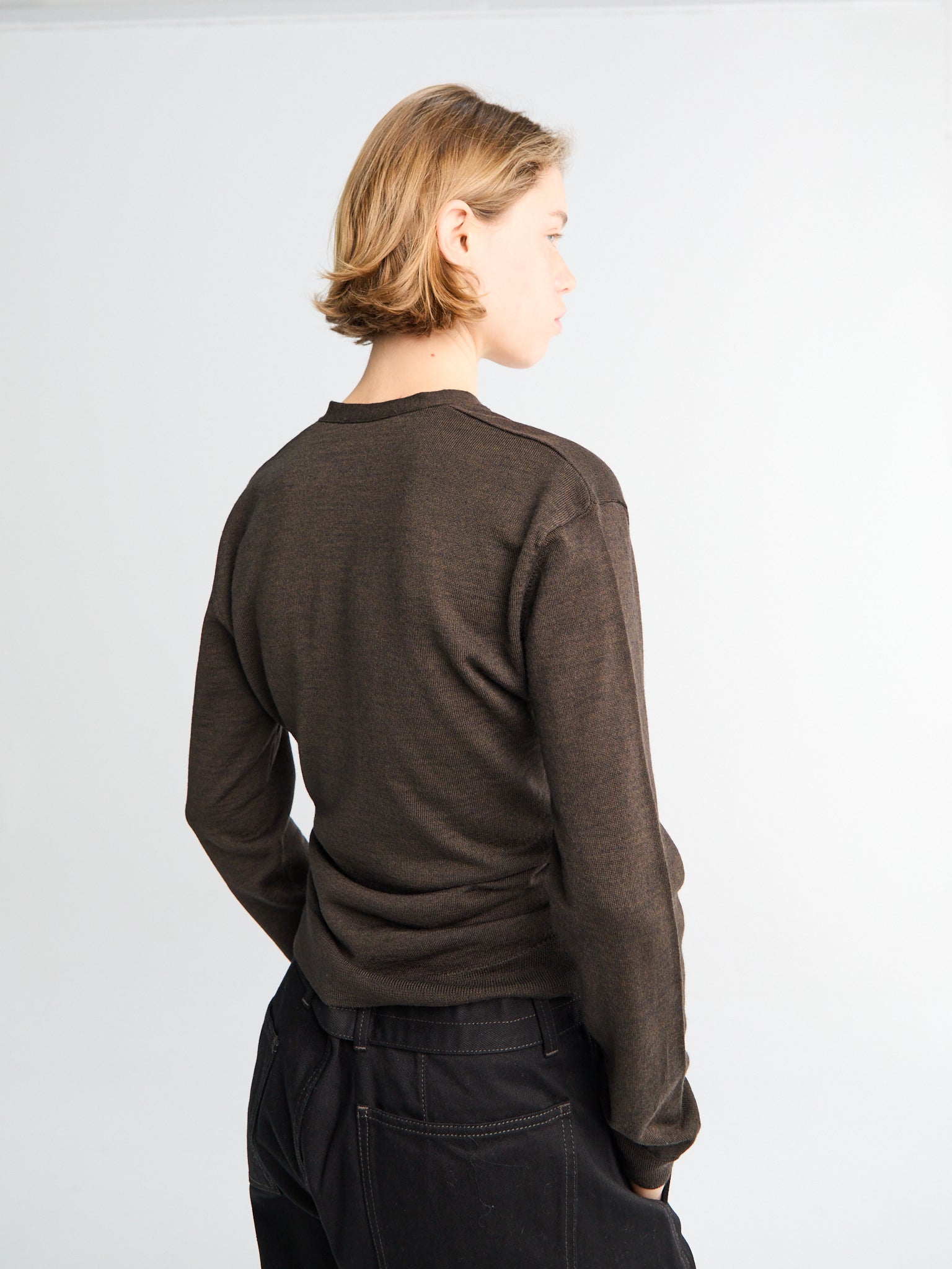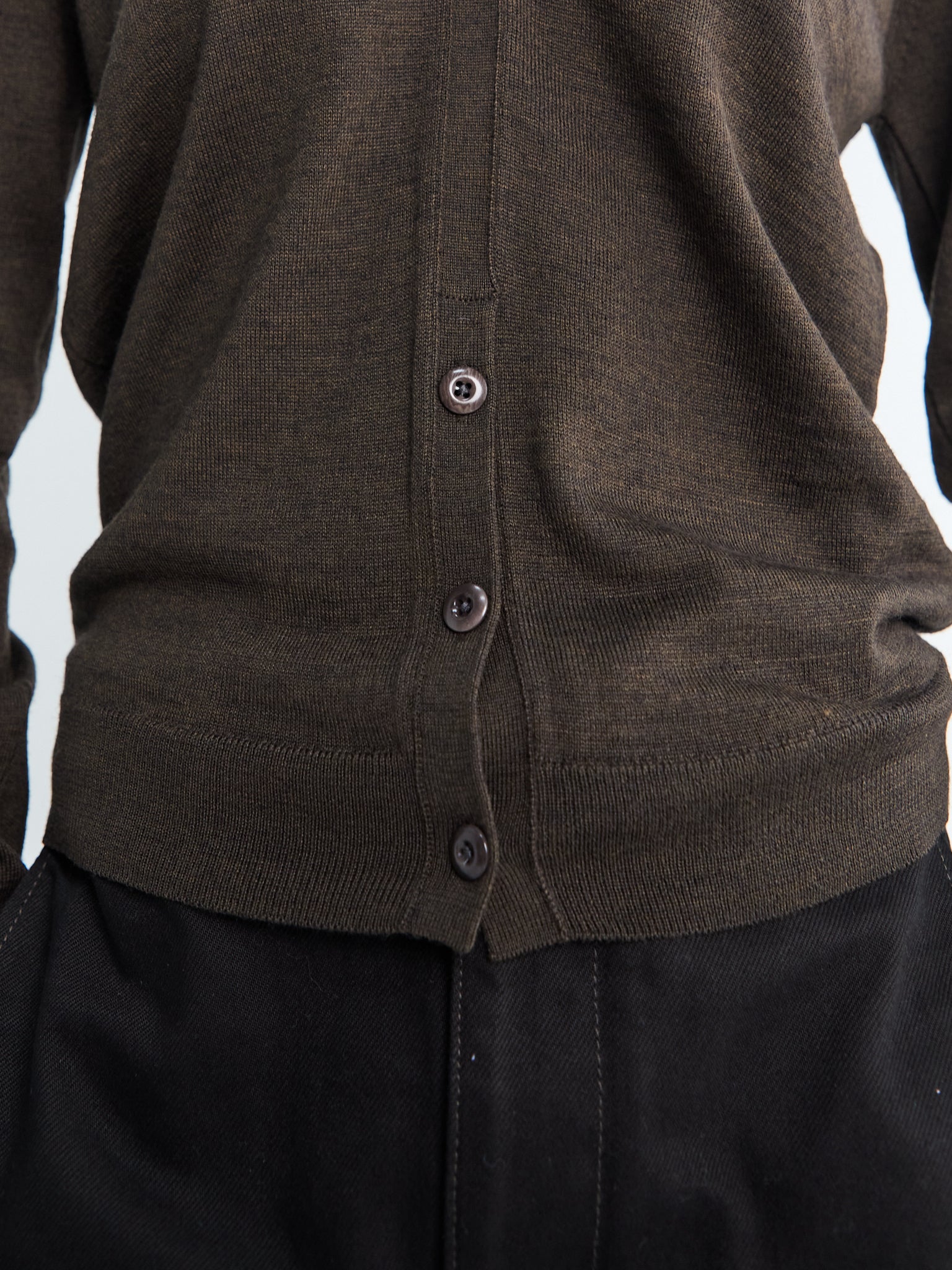 This wool and acrylic blend cardigan delivers understated elegance in a rich Dark Cacao shade. The V-neck silhouette is complemented by a front button closure and distinctive side buttons that create an asymmetrical fastening detail. Long sleeves with ribbed trims provide a polished finish, while the regular fit ensures a comfortable fit