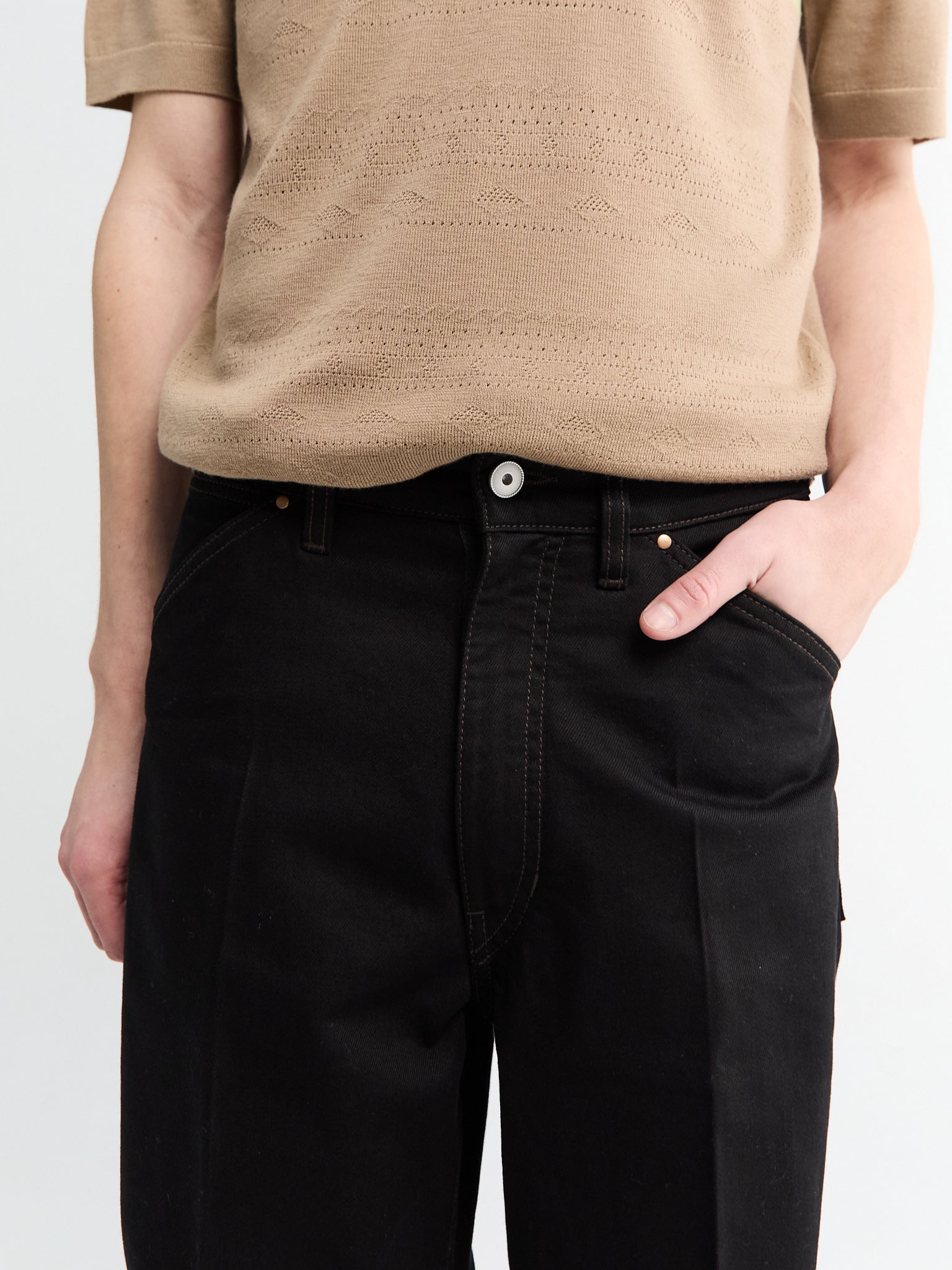 Black wide-leg denim trousers with an oversized fit. Features a zippered fly, belt loops, contrasting rivets, and Lemaire leather patch detail.