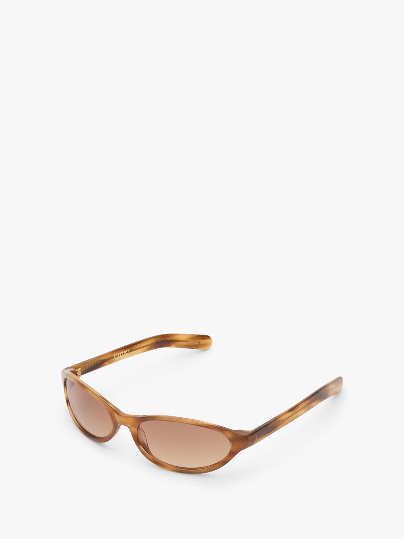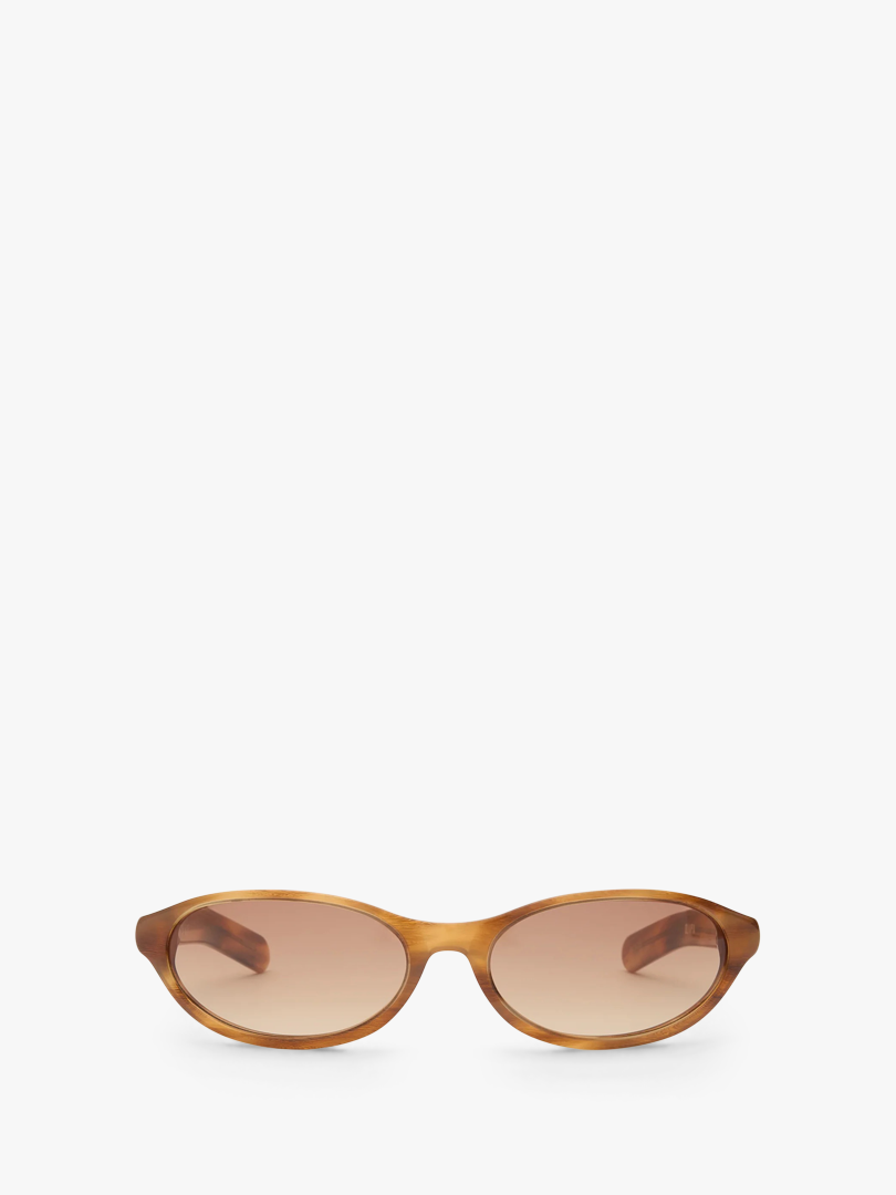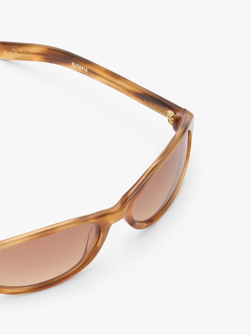 The Olympia sunglasses are crafted from a custom Donegal Horn acetate, giving each frame a unique, organic pattern. Light brown gradient lenses offer UVA/UVB protection, and the design is finished with subtle gold-tone details at the temples.