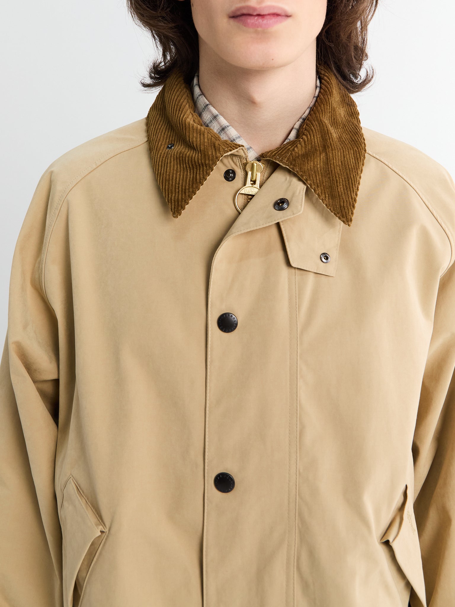 This oversized jacket is designed for a relaxed fit. It features a contrasting corduroy collar and two front pockets, including hand-warmer compartments.