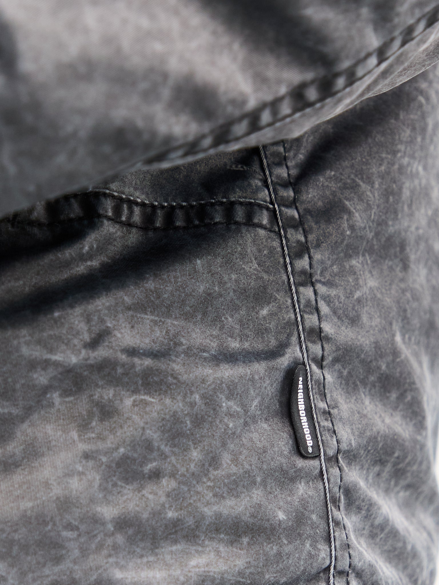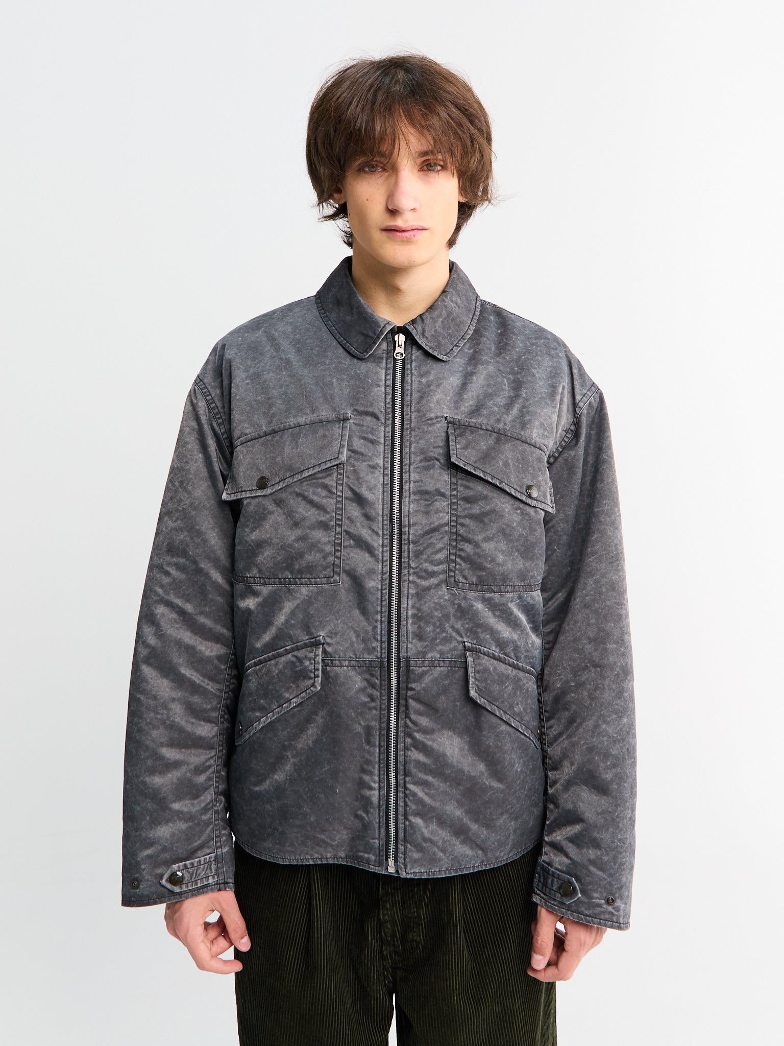 CWU-7P flight jacket crafted from nylon twill with a distinctive faded finish that develops character through wear. Multiple treatments including pigment coating and washer techniques create natural tanning effects over time. Quilted nylon ripstop lining provides warmth and durability, while original snap buttons and side clip tag complete the authentic design