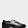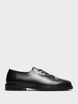 The Edouard Oxford shoe is crafted from smooth black leather and features a criss-cross lace-up design. It has a round toe with tonal stitching and a thick leather sole with rubber inserts. Handcrafted using Blake construction, it comes with a dust bag for storage.