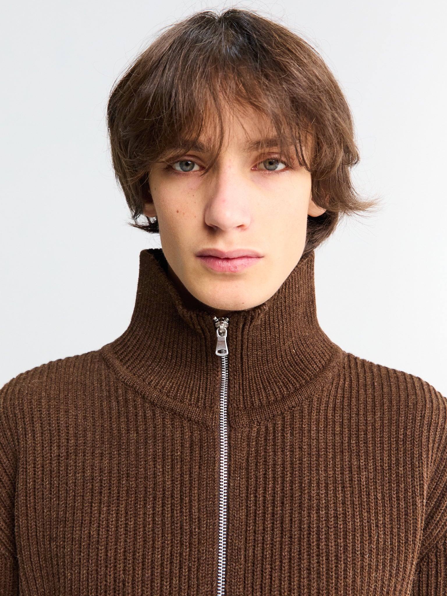 Navy Full Zip Pockets Knitwear in Natural Brown