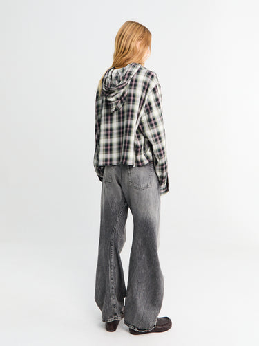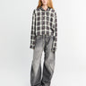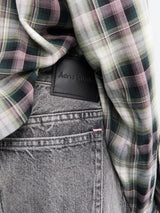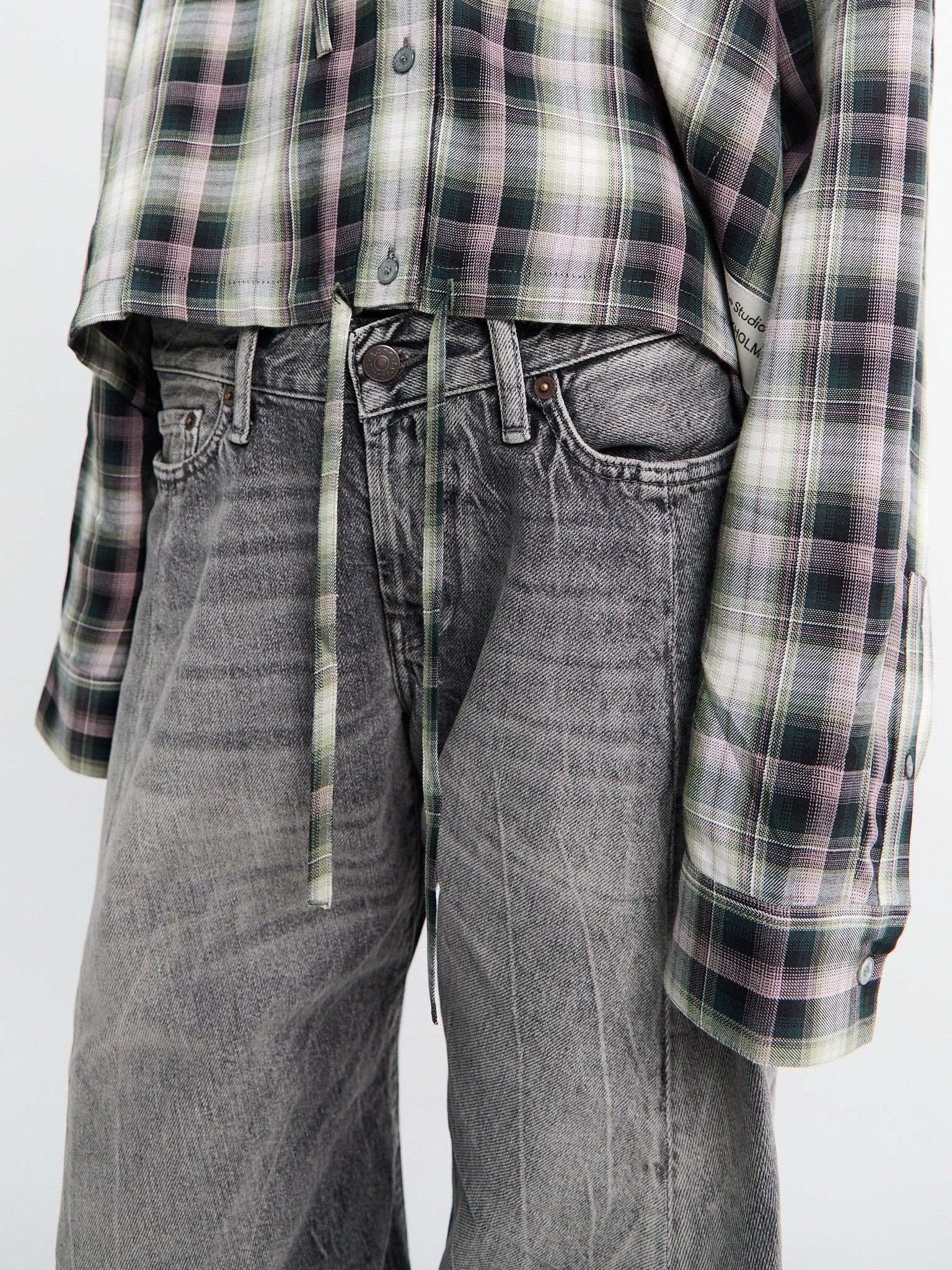 Loose-constructed denim pants, these jeans showcase a mid-tone washed finish enhanced with distinctive rags and tied details. The relaxed silhouette features a low waist, generously wide leg, and long length, secured with a button fly. Each pair's unique distressing ensures no two garments are identical.