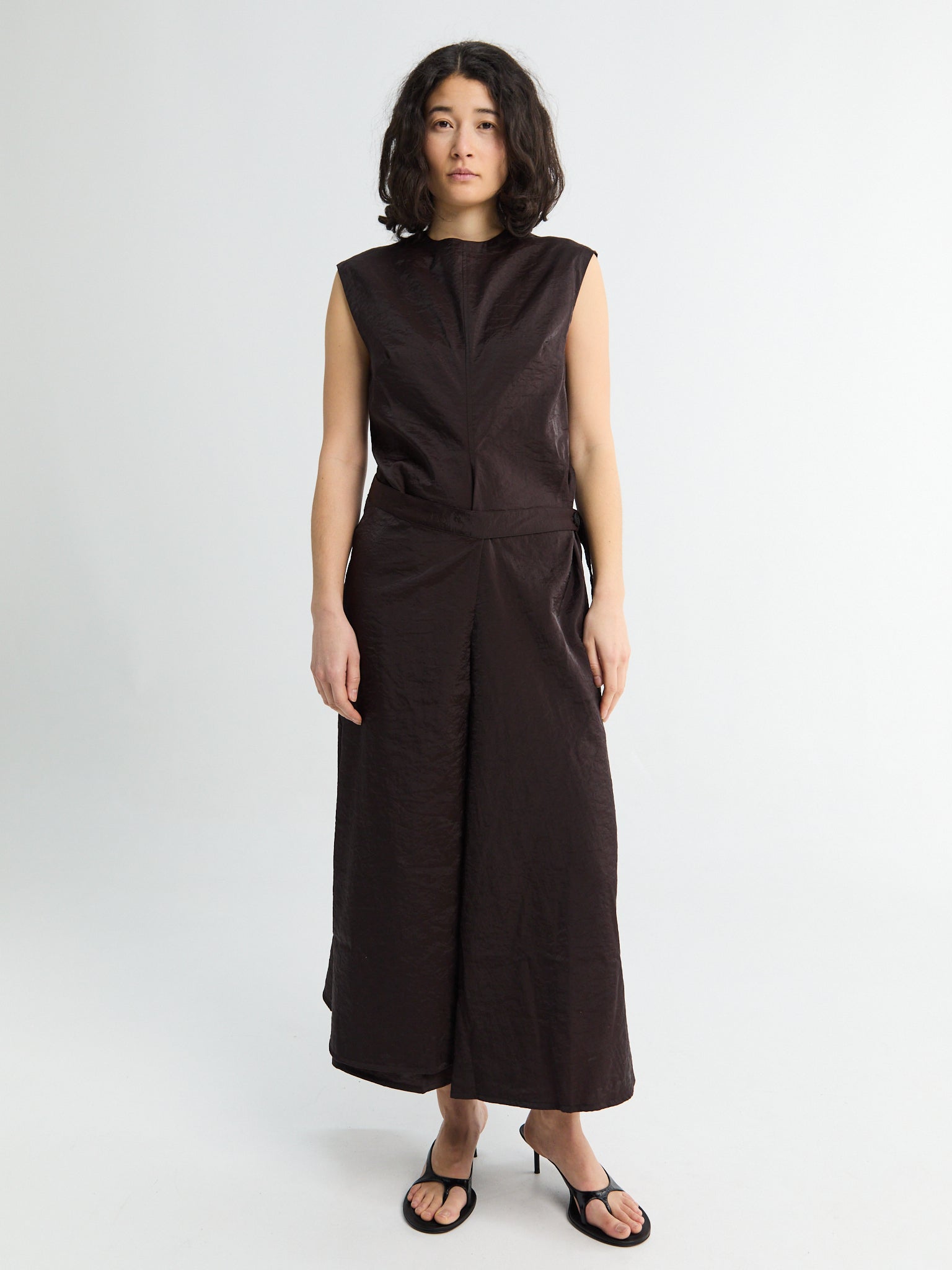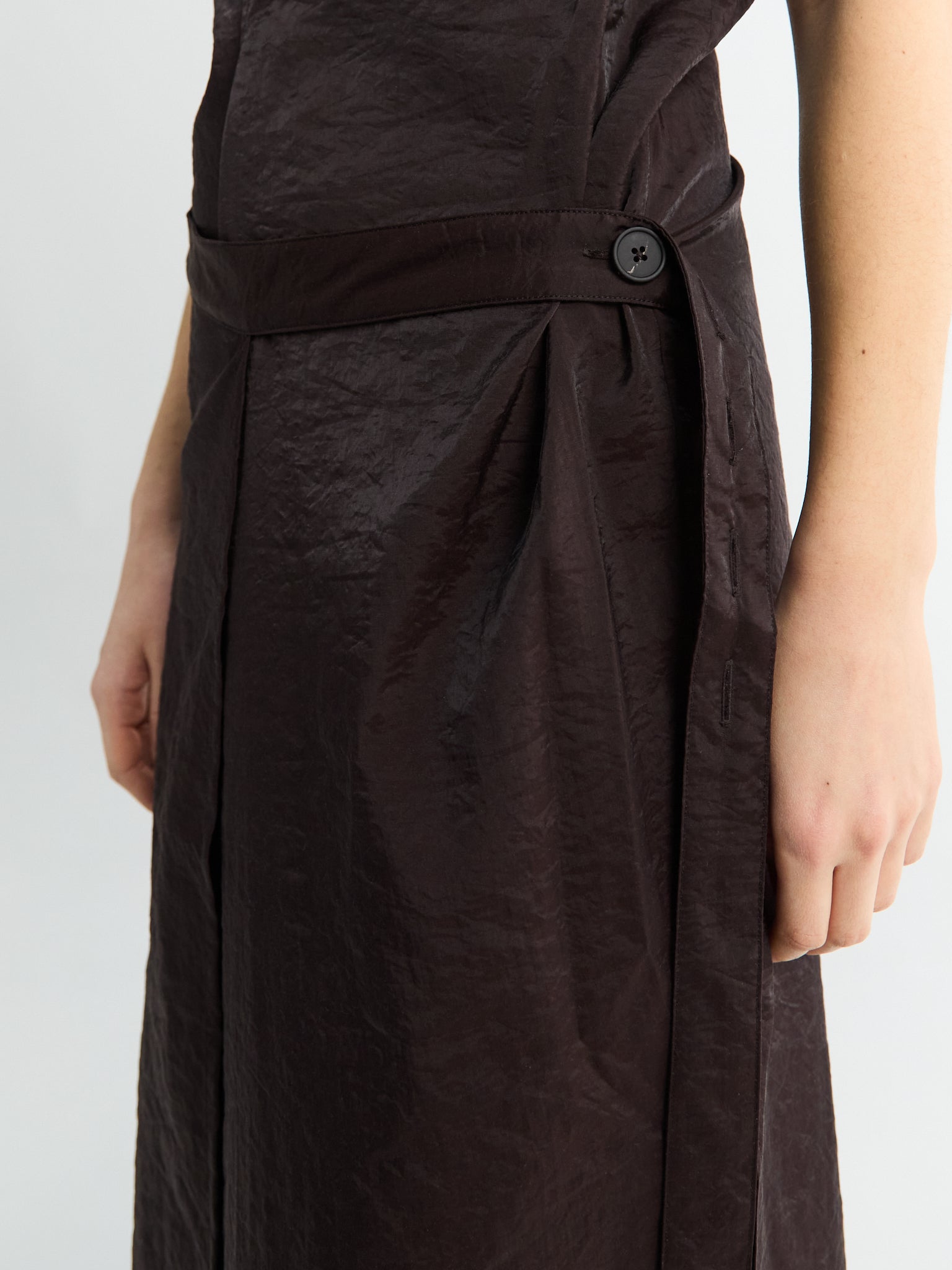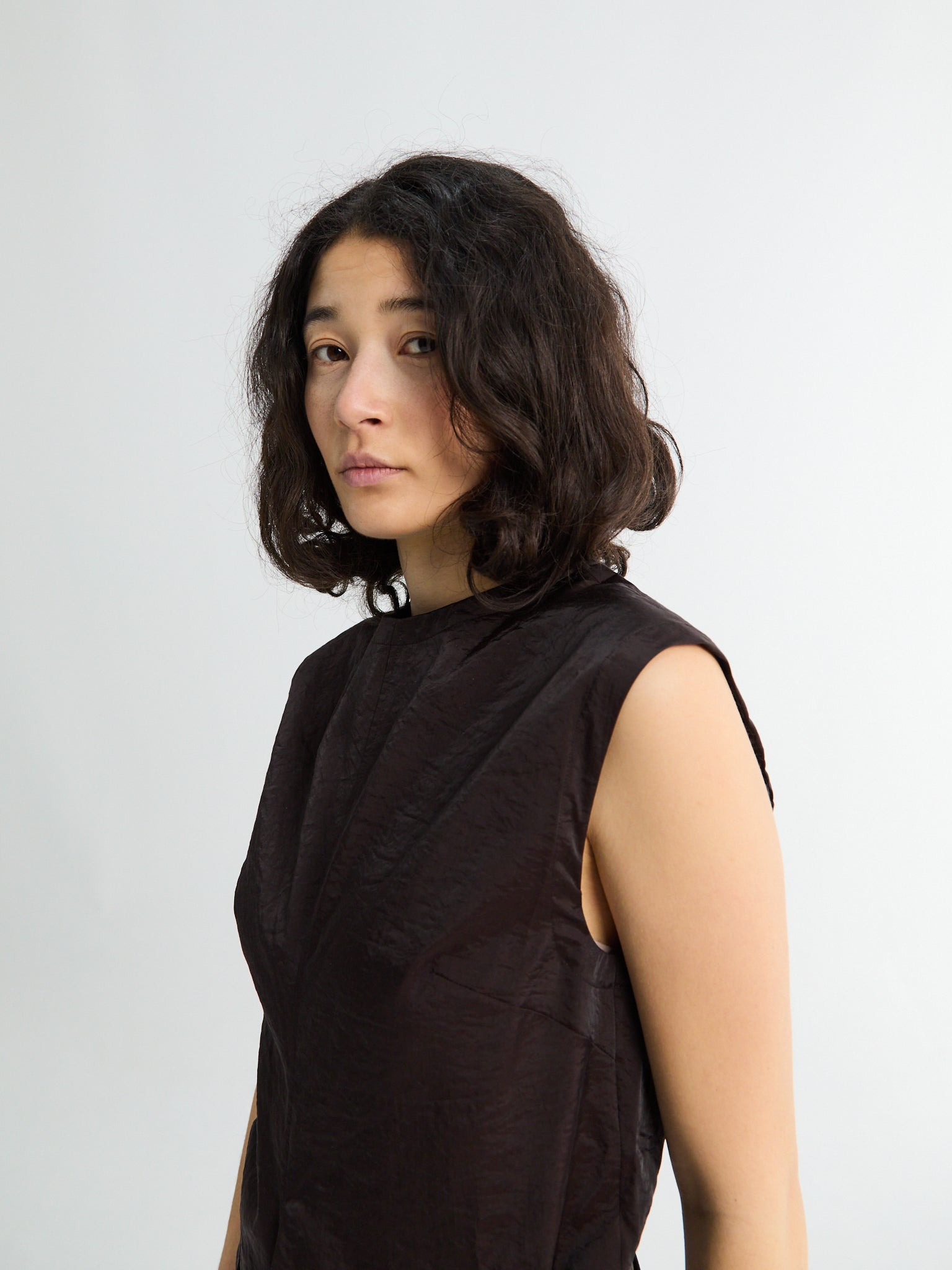 This architectural dress is defined by a voluminous silhouette rendered in a rich cocoa hue. Wide shoulder straps provide structure, allowing the form to flow into a clean A-line body.